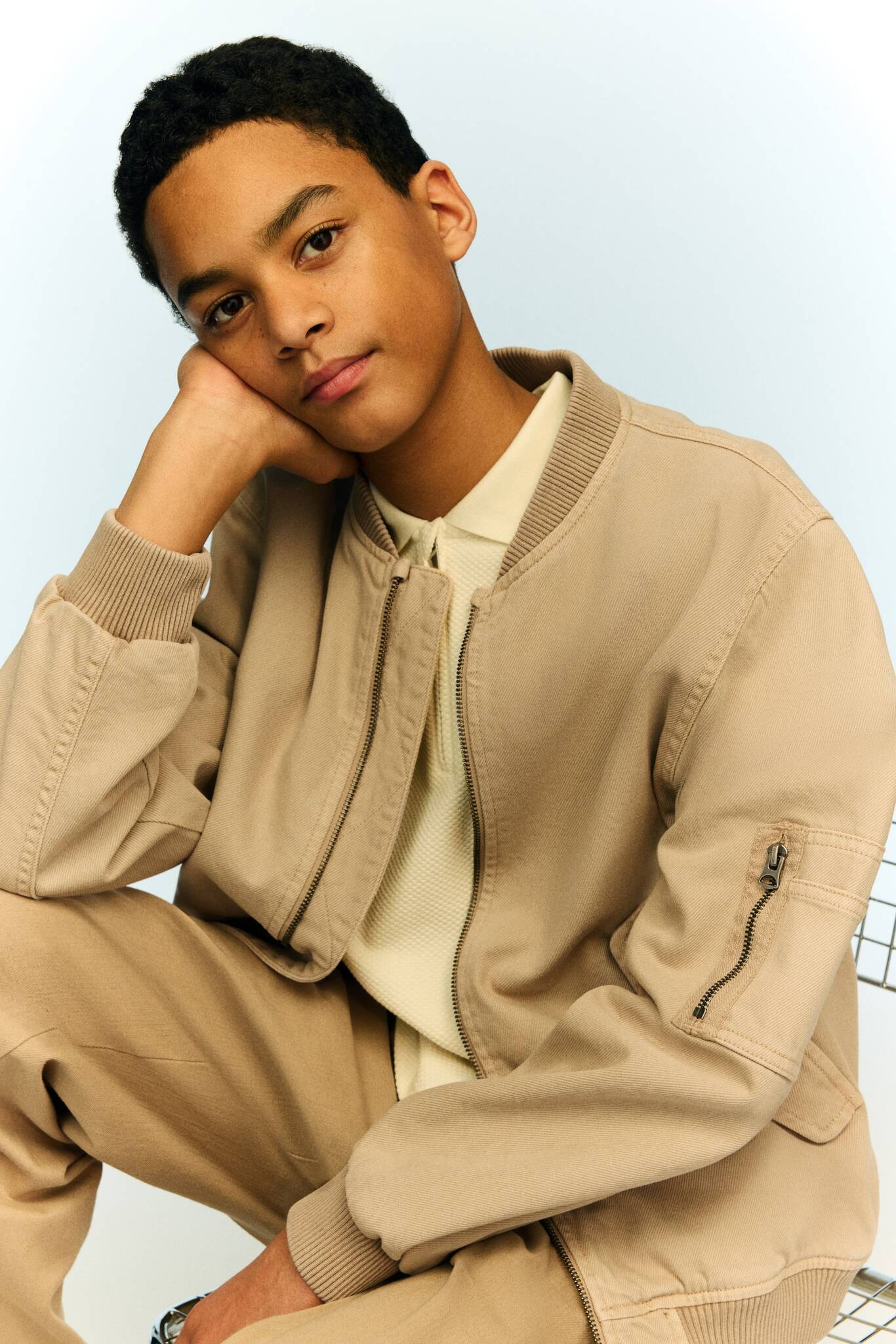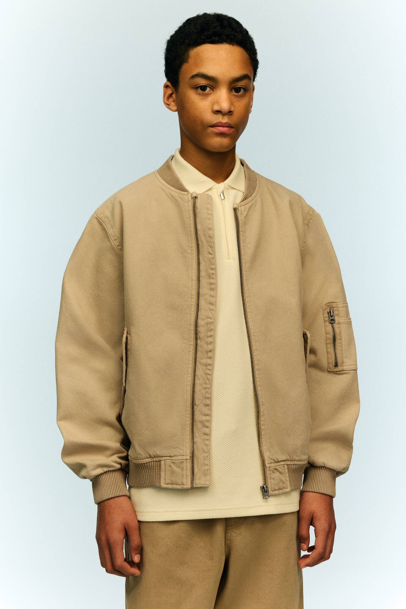 Куртка из хлопкового твила с воротником-стойкой, не раздражающей кожу молнией спереди с защитой подбородка и передними карманами с клапанами на кнопках. Спущенная линия плеча, длинные рукава и карман на молнии на одном рукаве. Воротник, манжеты и подол выполнены из трикотажной ткани в рубчик. На подкладке.