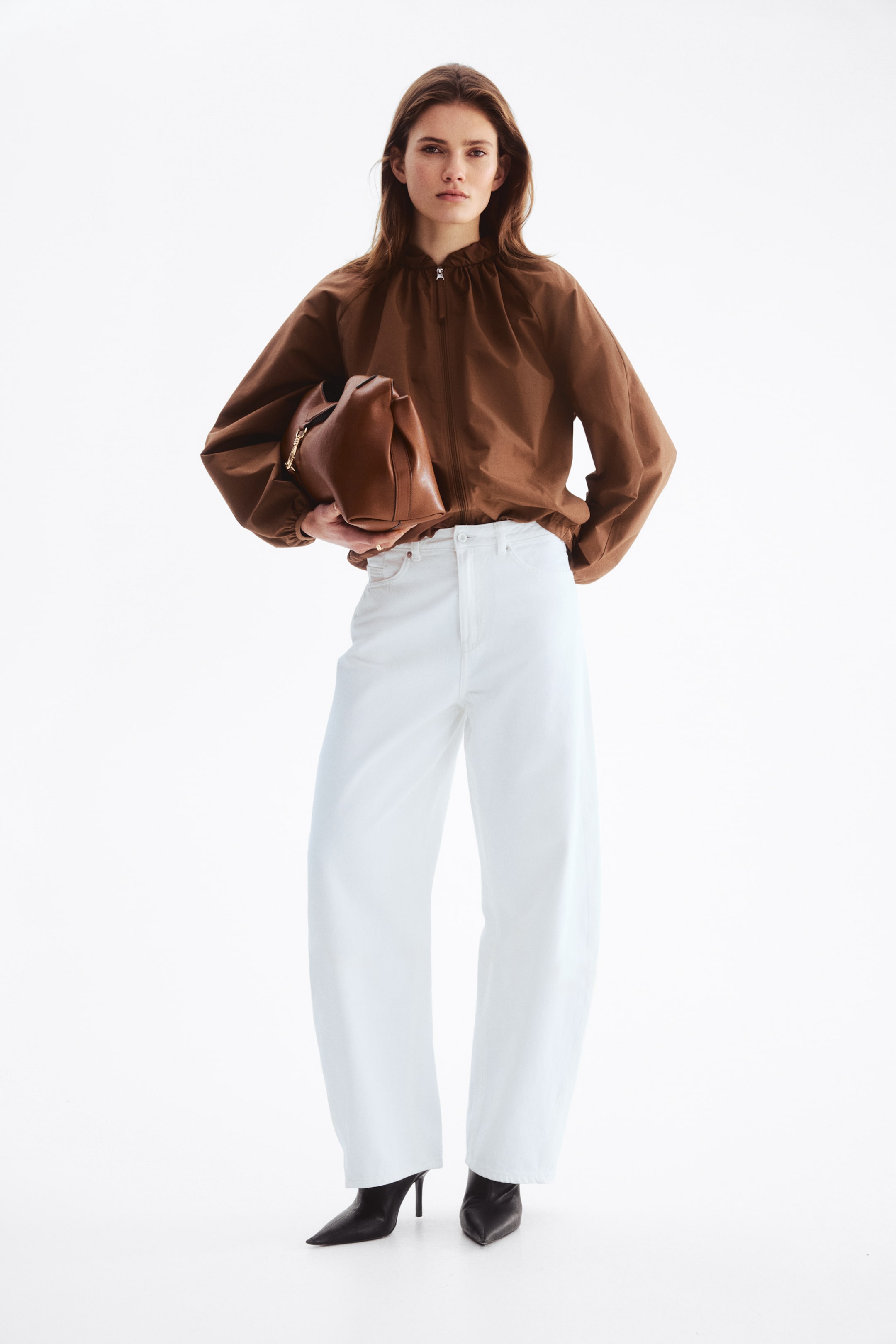 Куртка свободного кроя из тканого материала с присборенным воротником-стойкой, застежкой-молнией спереди и потайными боковыми карманами. Длинные рукава реглан с эластичными манжетами и подолом. На подкладке.