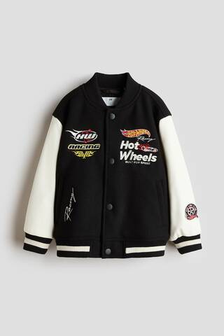 Фетровая бейсбольная куртка с декоративным рисунком и контрастными рукавами с покрытием. Воротник-стойка в рубчик, застежка на кнопки, боковые карманы с кантом. Широкая ребристая отделка на манжетах и подоле. На подкладке.