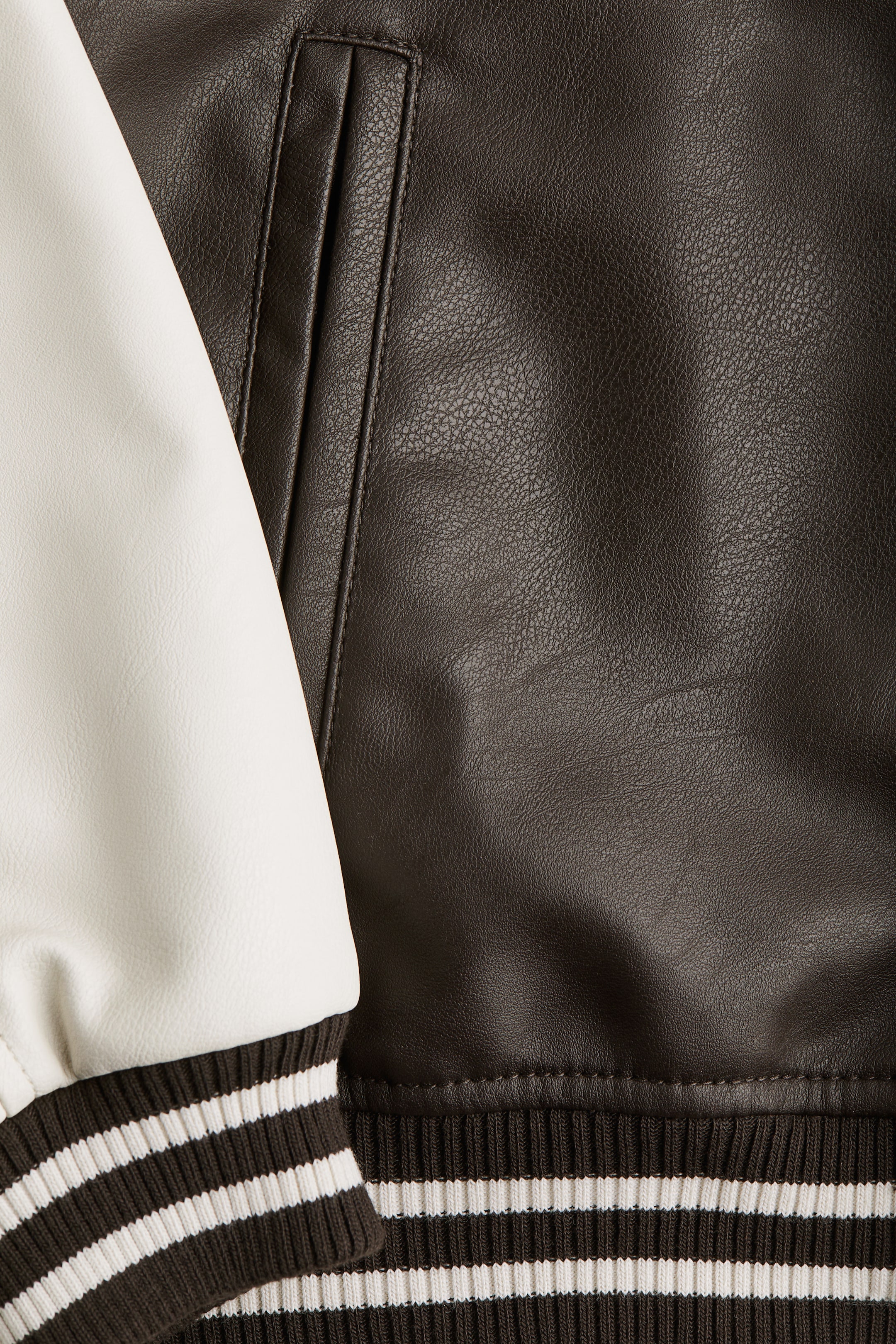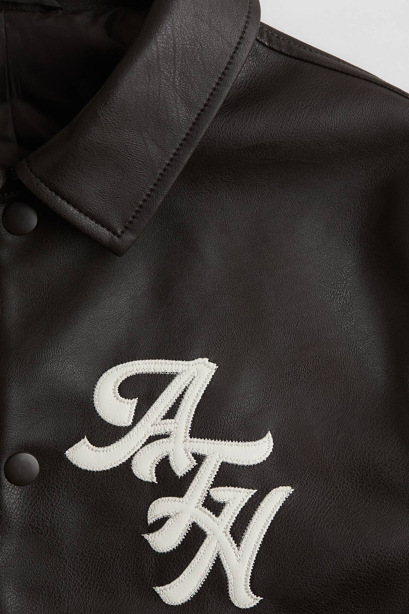 Бейсбольная куртка свободного кроя из ткани с покрытием, воротником, вышитыми деталями спереди, застежками на кнопки спереди, прорезными карманами спереди и резинкой на манжетах и подоле. На подкладке.