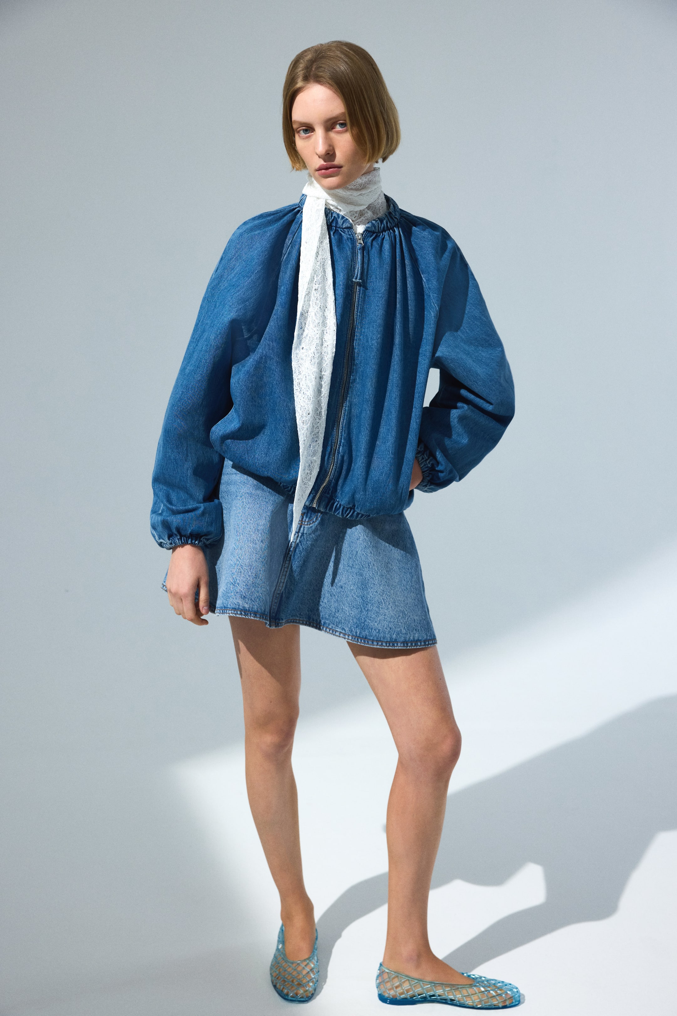 Куртка свободного кроя из тканого материала с присборенным воротником-стойкой, застежкой-молнией спереди и потайными боковыми карманами. Длинные рукава реглан с эластичными манжетами и подолом. На подкладке.