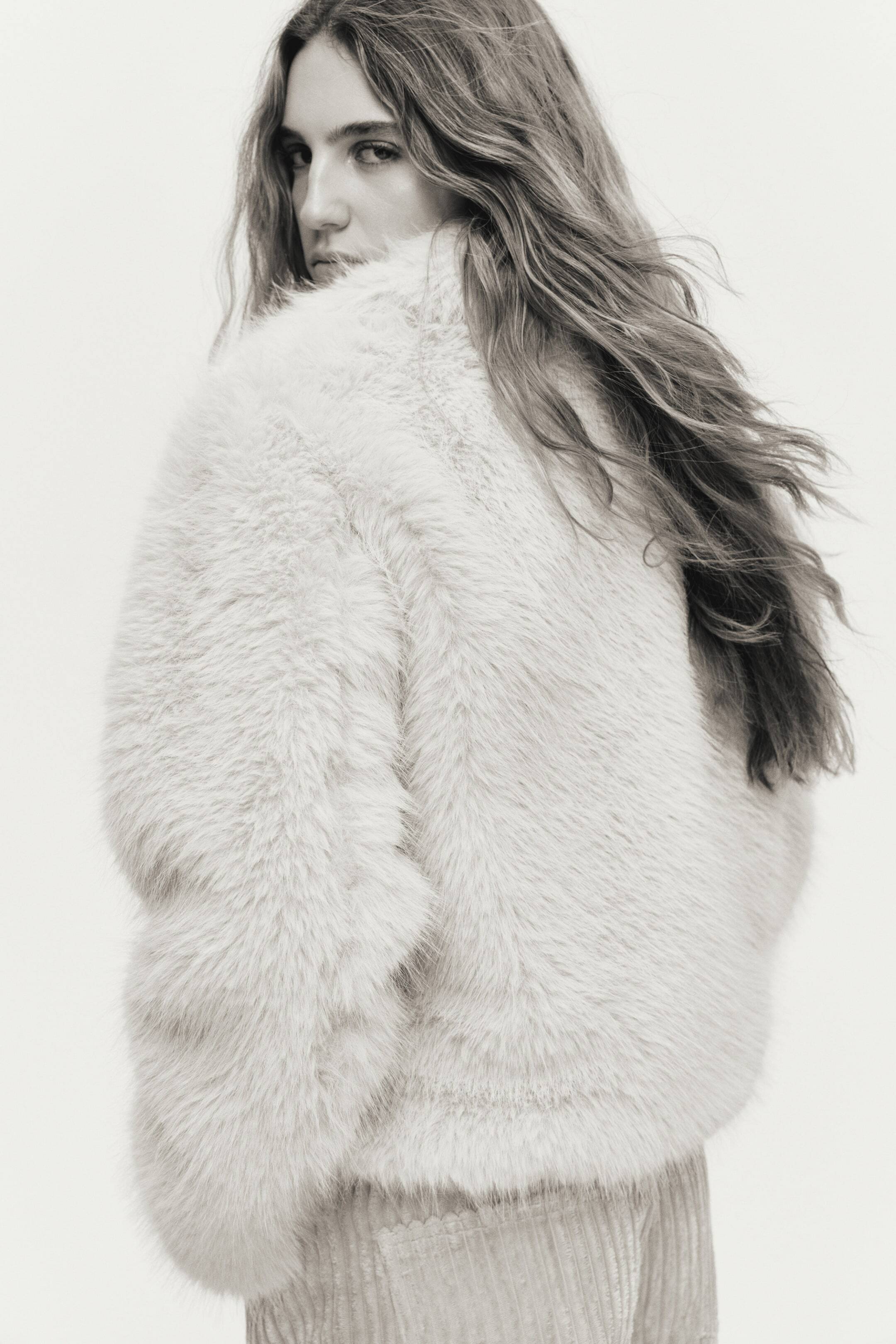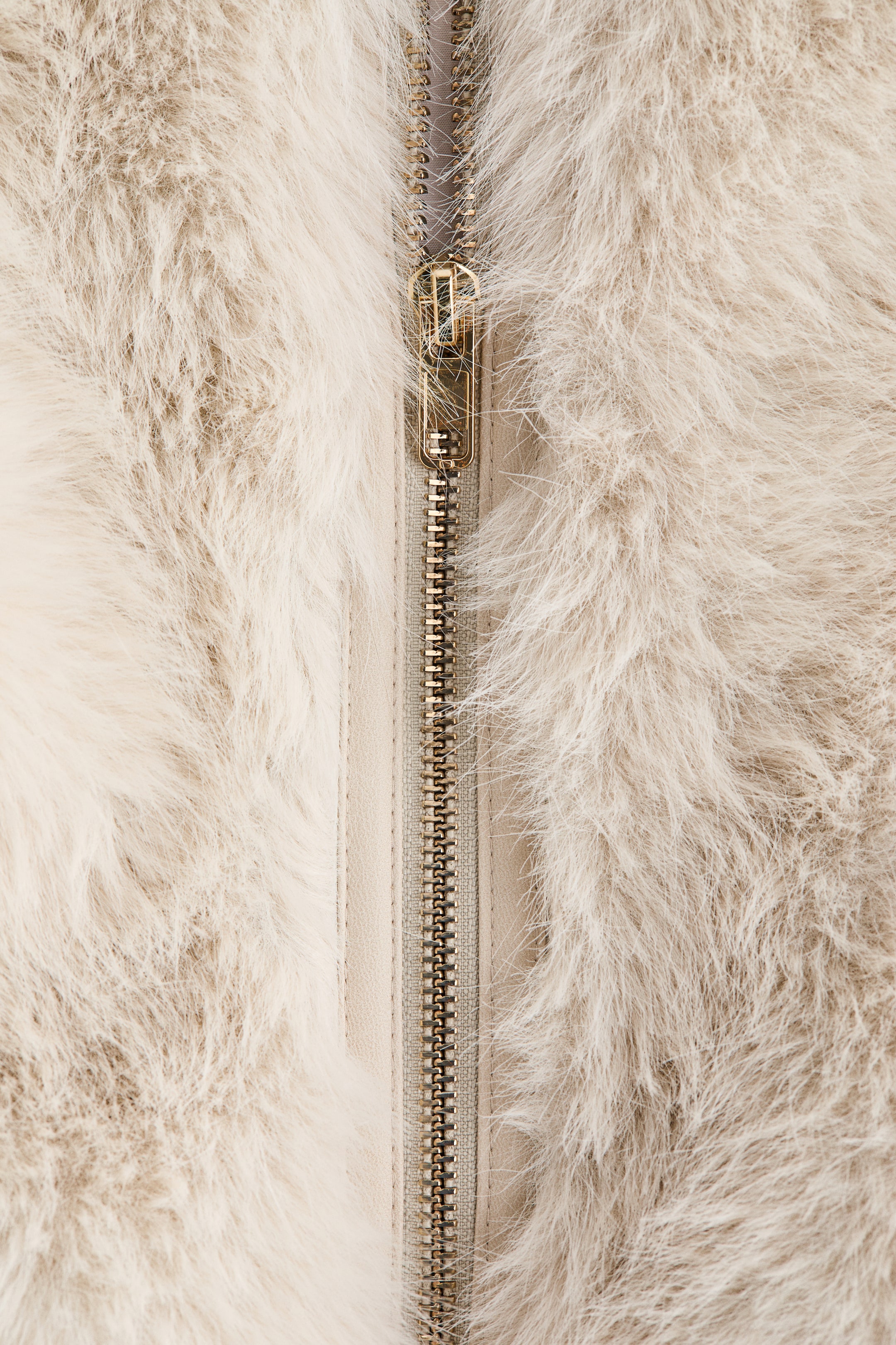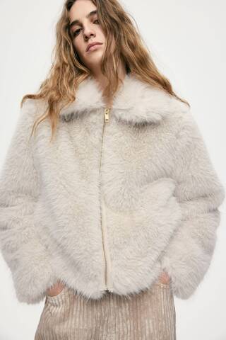 Шуба из мягкого искусственного меха. Длинный воротник, застёжка-молния и незаметные боковые карманы. На подкладке.