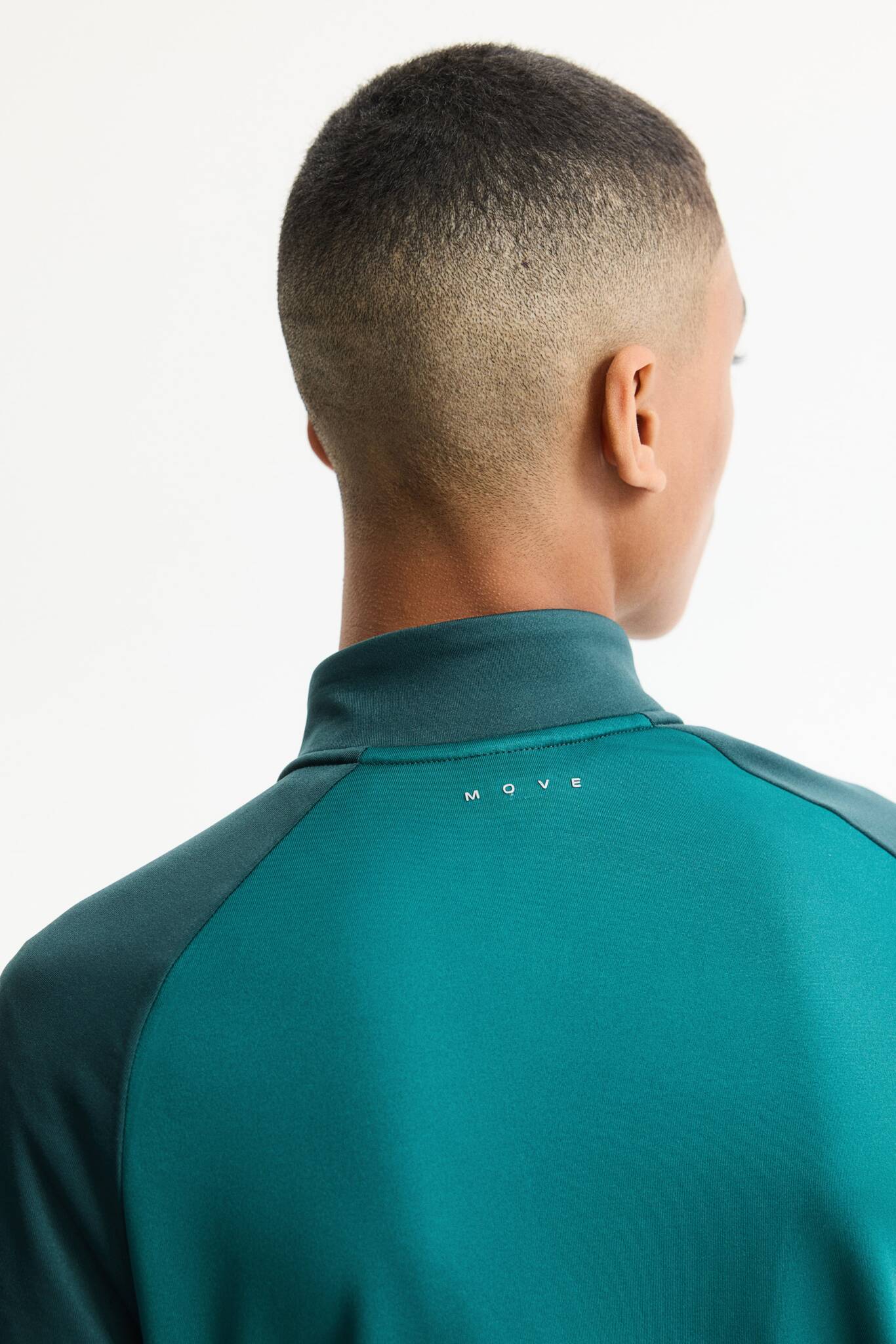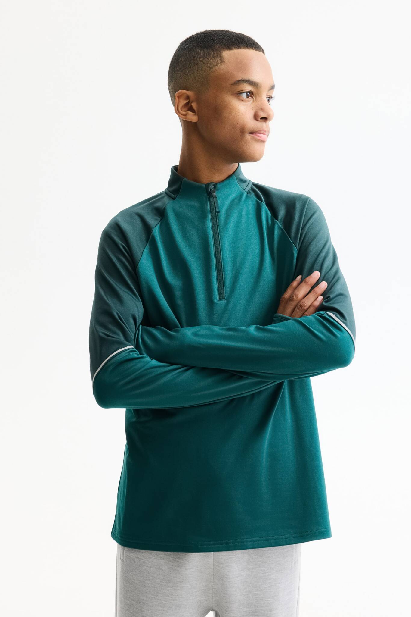 Футболка из мягкого джерси с флисовой подкладкой. Функциональные вставки из тканого материала с технологией ThermoMove™ сохраняют тепло при низких температурах. Классический крой, небольшой воротник-стойка, молния сверху, удлиненные рукава реглан с прорезями для больших пальцев и светоотражающие детали. Можно носить отдельно или как утепляющий средний слой.