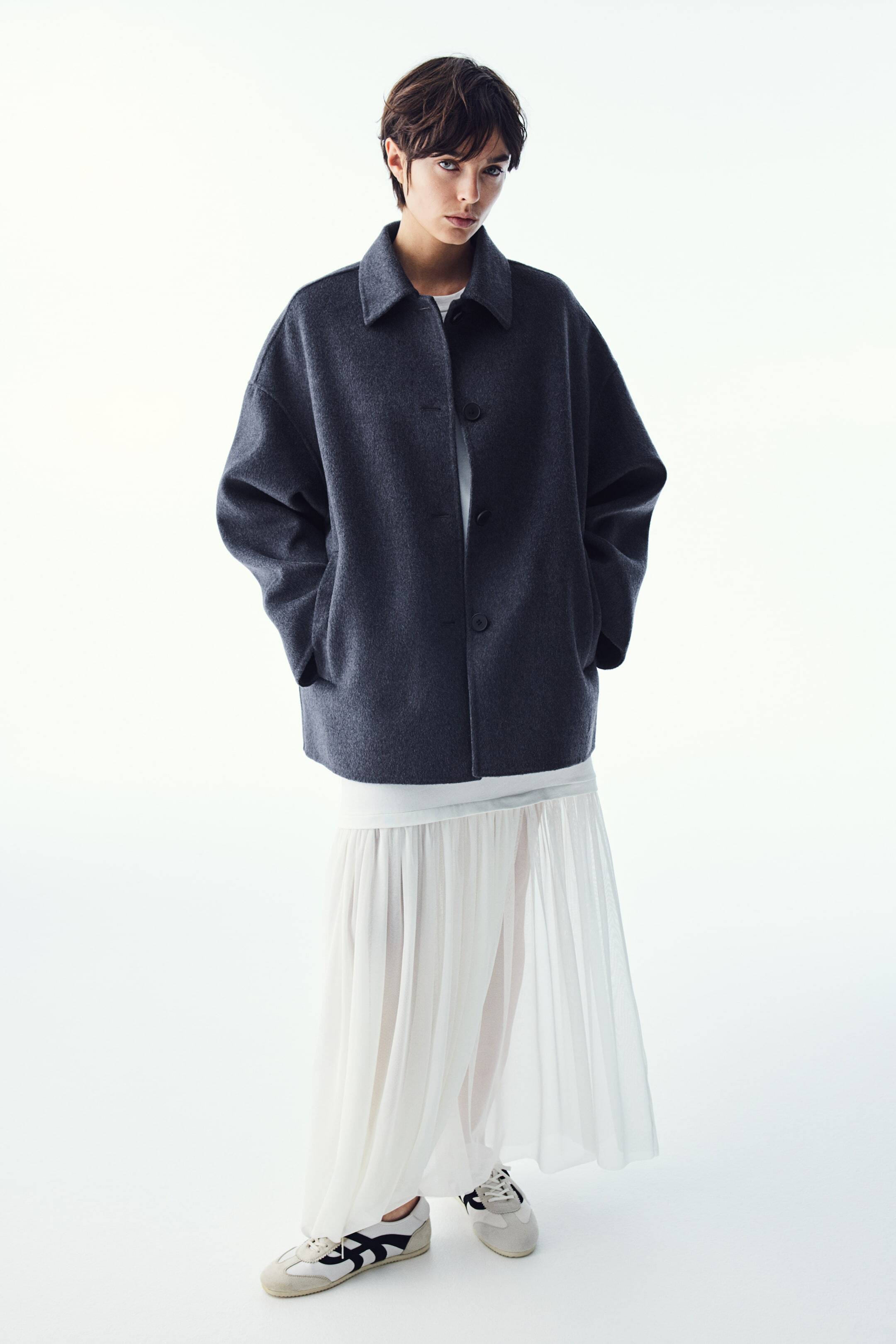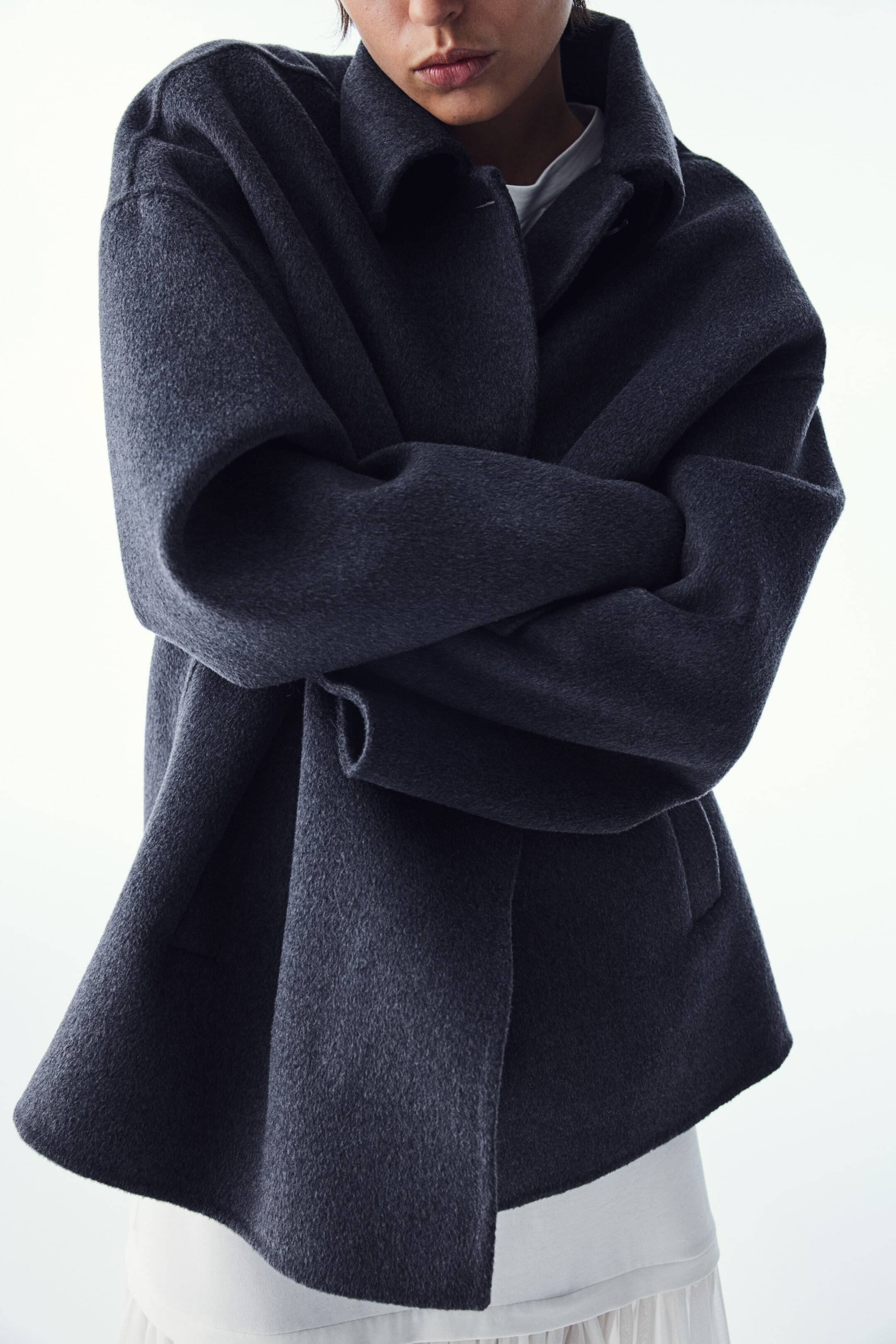 Куртка ручной работы из фетровой шерстяной смеси. Свободный фасон с воротником и пуговицами спереди, спущенными плечами и врезными боковыми карманами. Без подкладки.