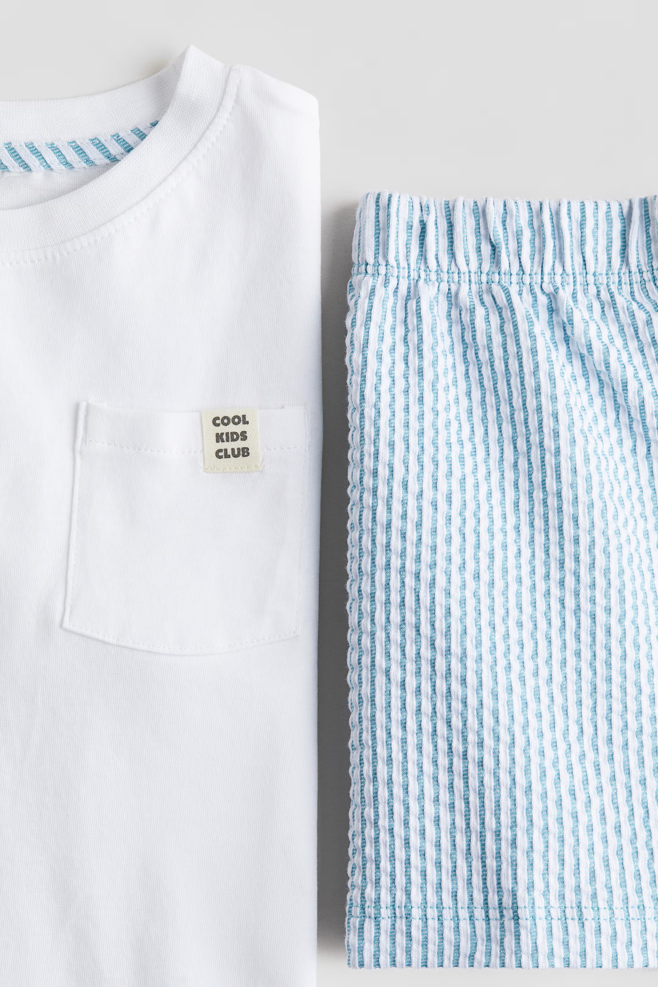 Пижамный комплект, включающий футболку и шорты. Футболка изготовлена из мягкого хлопкового трикотажа с ребристым круглым вырезом и нагрудным карманом. Шорты изготовлены из вафельного трикотажа с эластичным поясом.