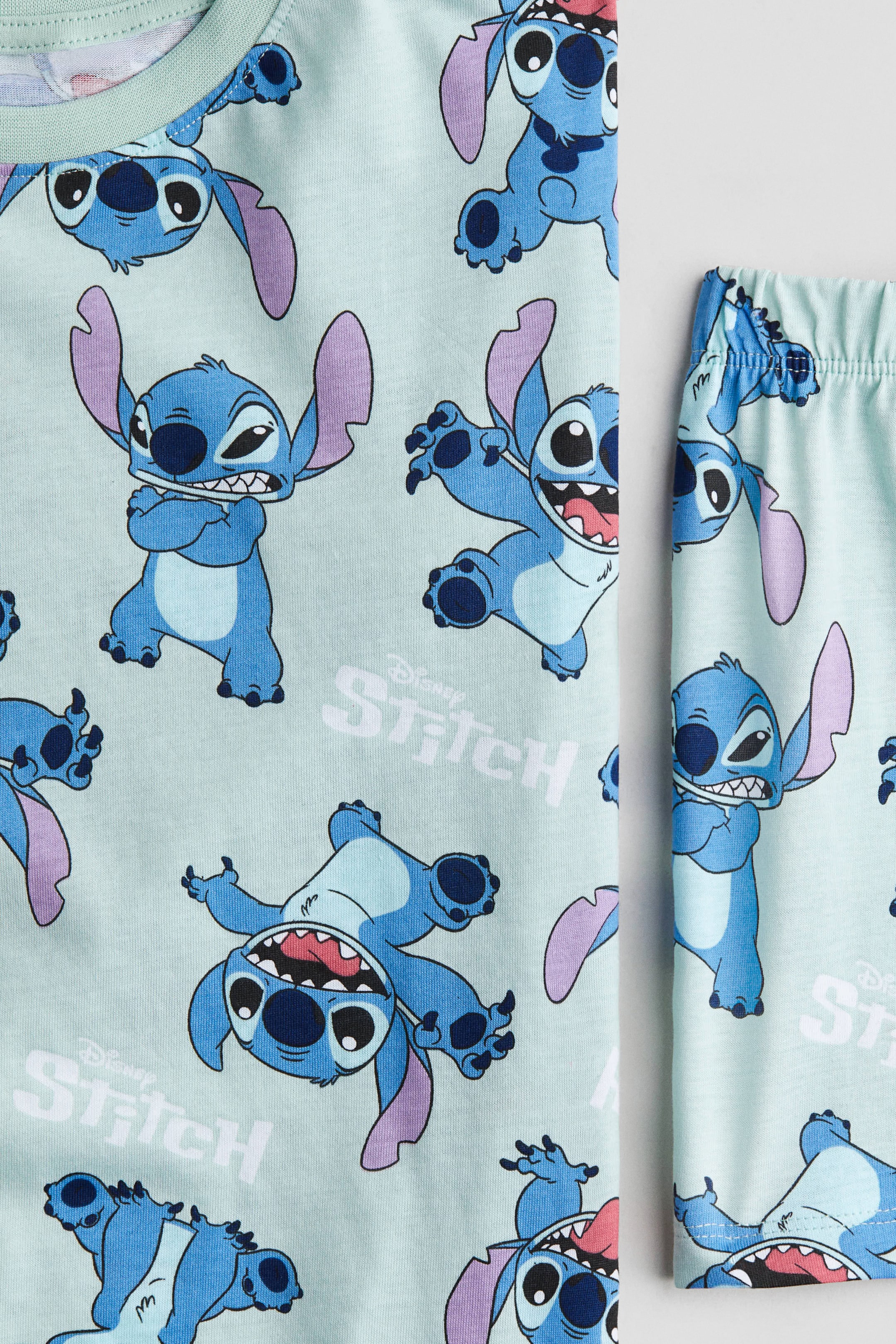Пижамный комплект из хлопка и трикотажа с принтом. Футболка с круглым вырезом и приспущенными плечами. Шорты с эластичным поясом, скрытым под одеждой.