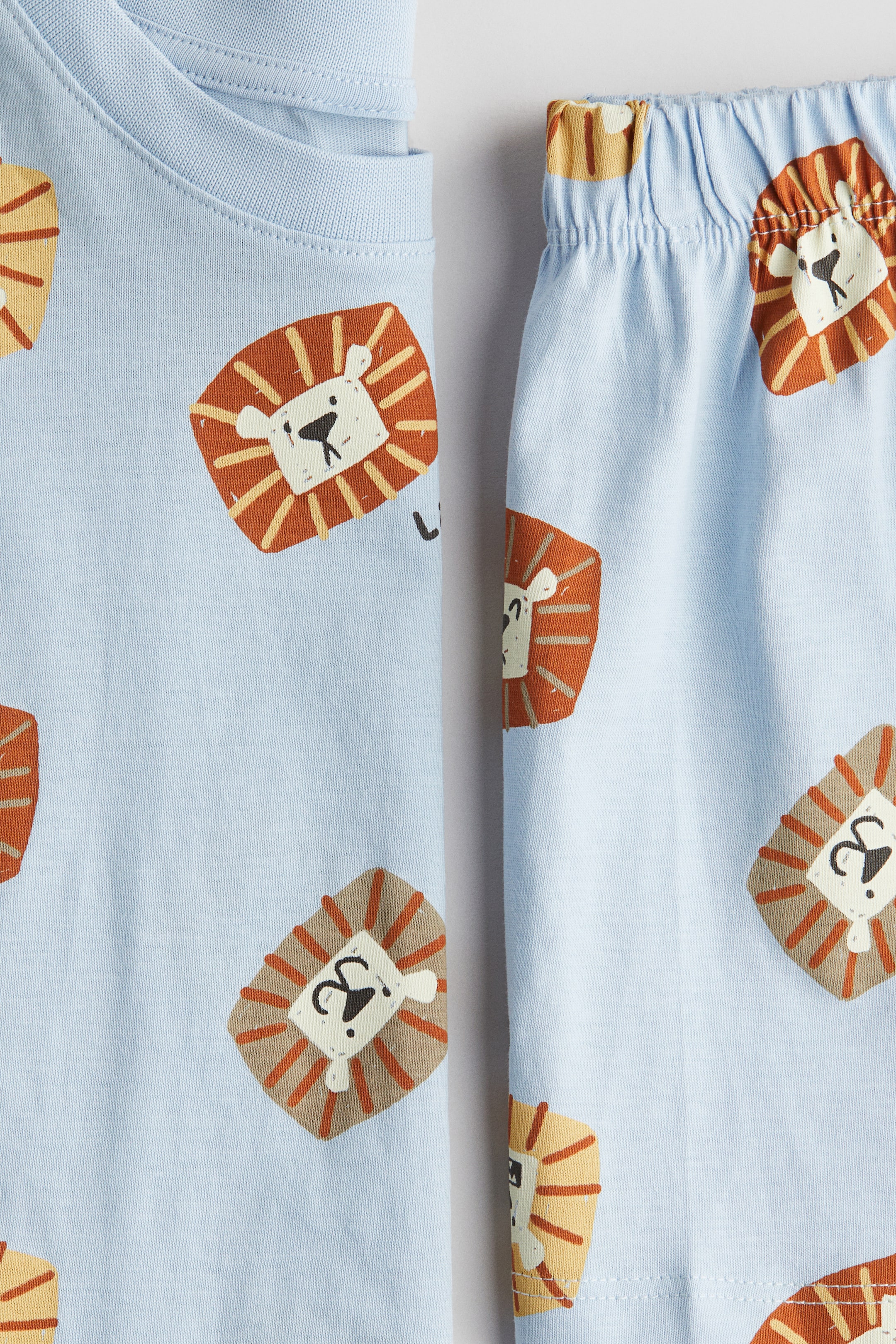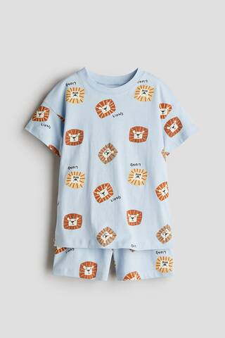 Пижамный комплект из мягкого хлопкового трикотажа с принтом. Футболка с короткими рукавами, ребристой отделкой, круглым вырезом и приспущенными плечами. Шорты на резинке.