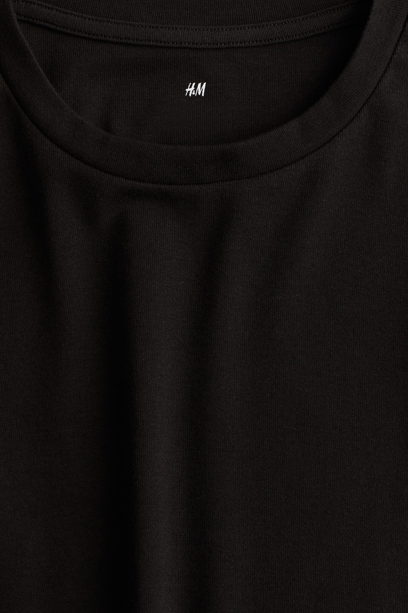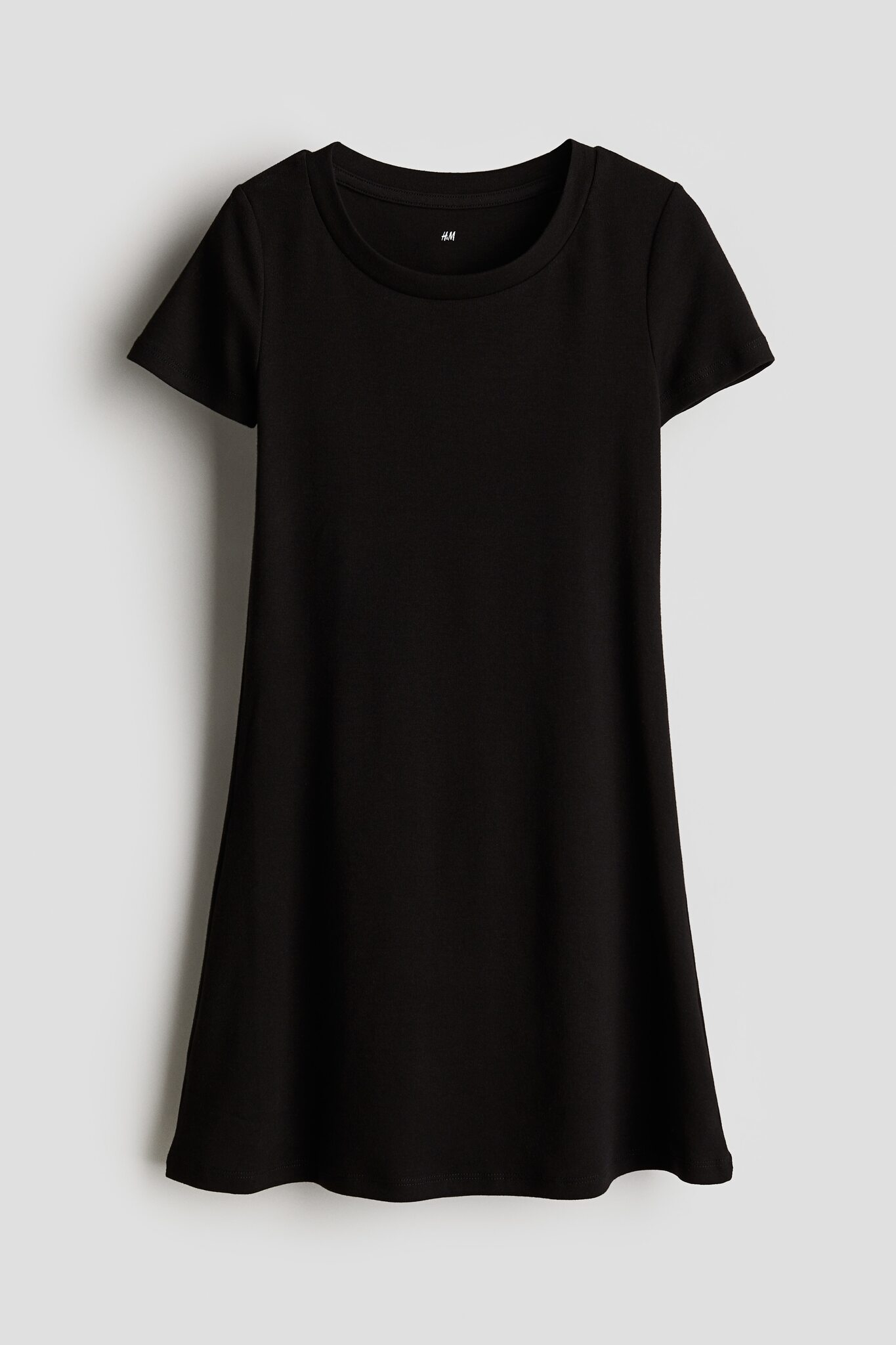 Свободное платье из мягкого трикотажа с круглым вырезом, короткими рукавами и слегка расклешенной юбкой.