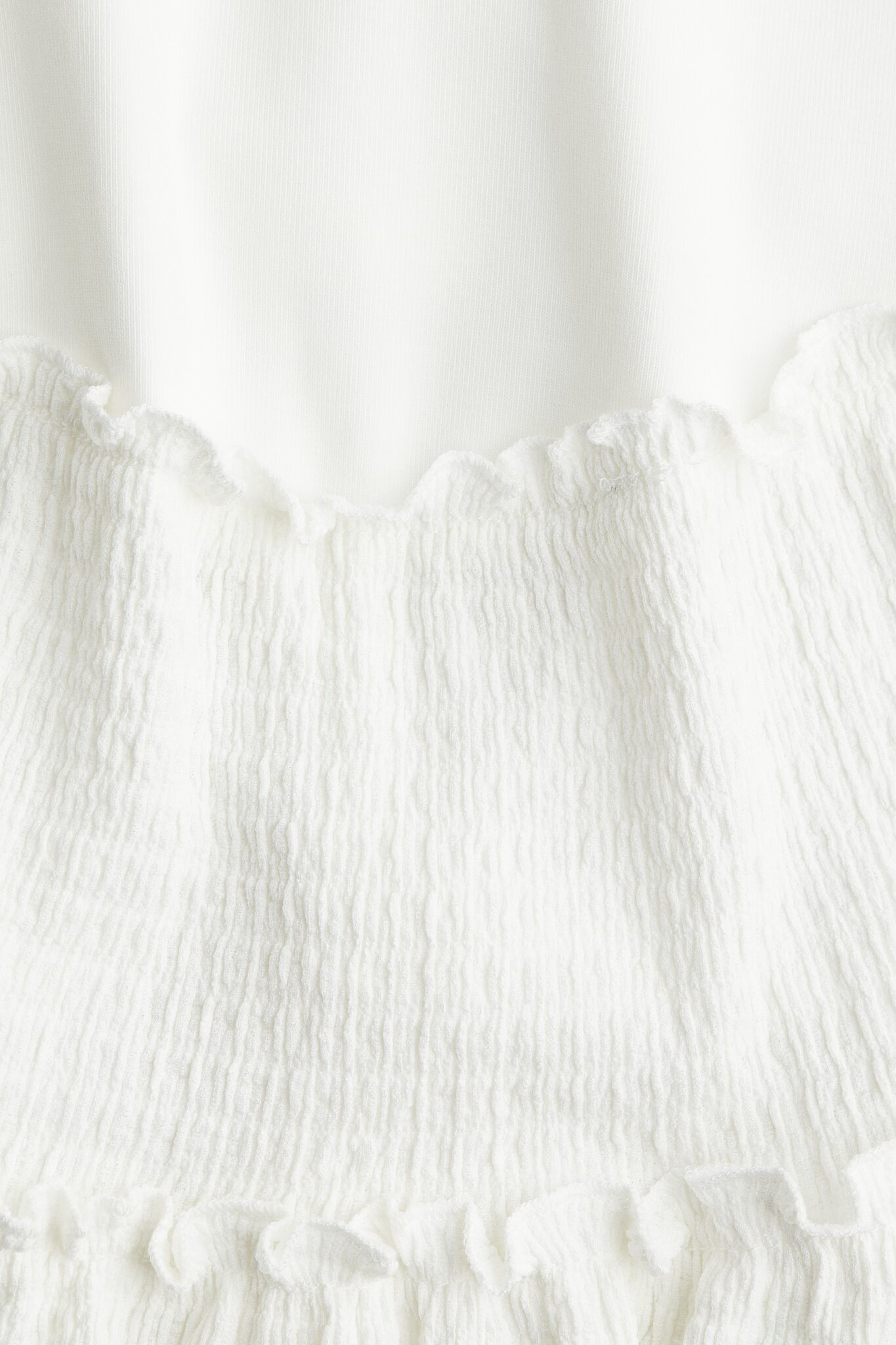 Платье без рукавов из мягкого хлопкового трикотажа с круглой горловиной и узкой отделкой по горловине и проймам. Талия скруглённая, отрезная, многослойная юбка с воланами из фактурного трикотажа.