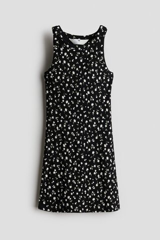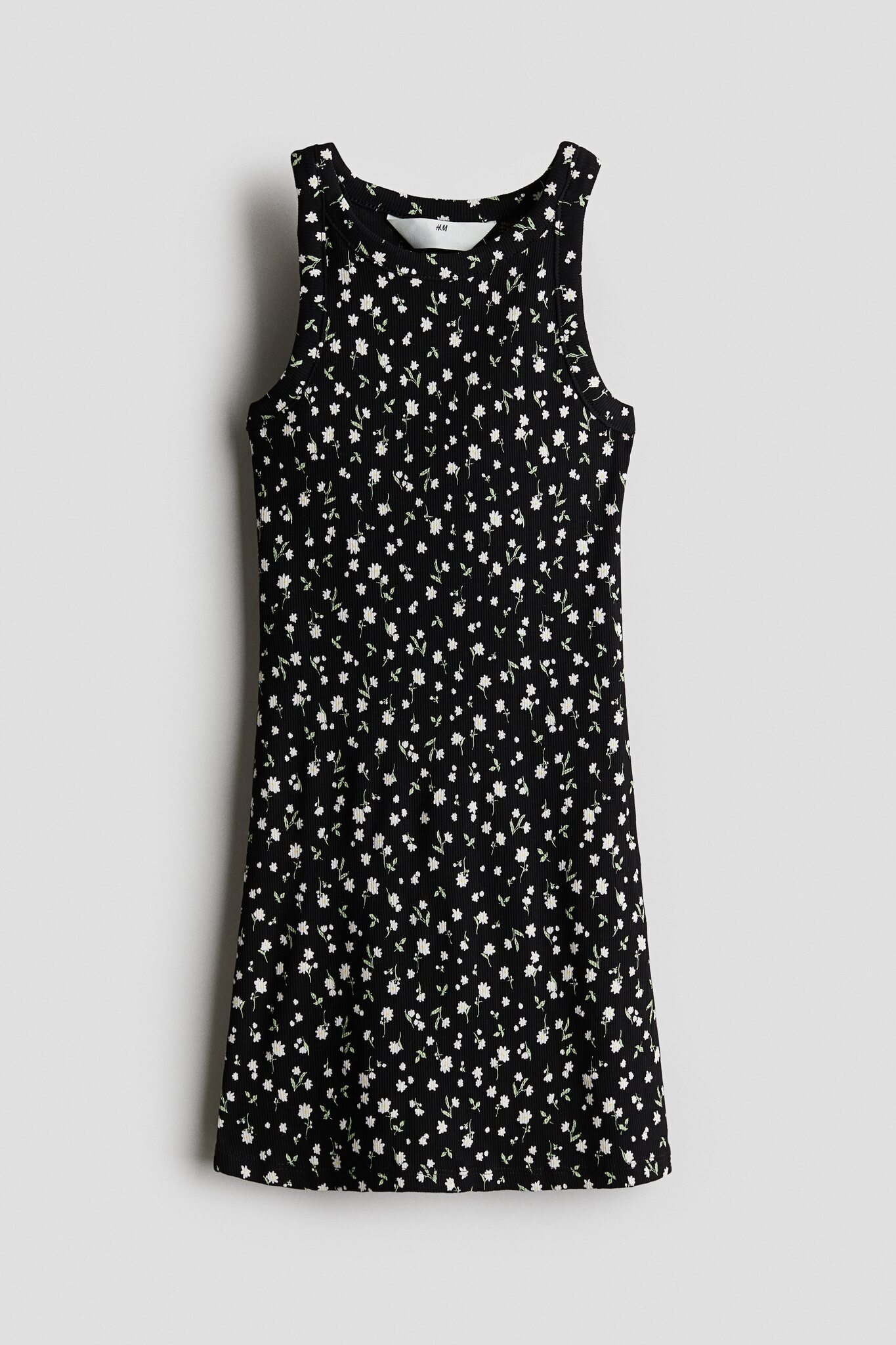Платье без рукавов из хлопчатобумажного трикотажа с принтом в рубчик, с отделкой вокруг горловины и пройм.
