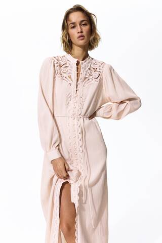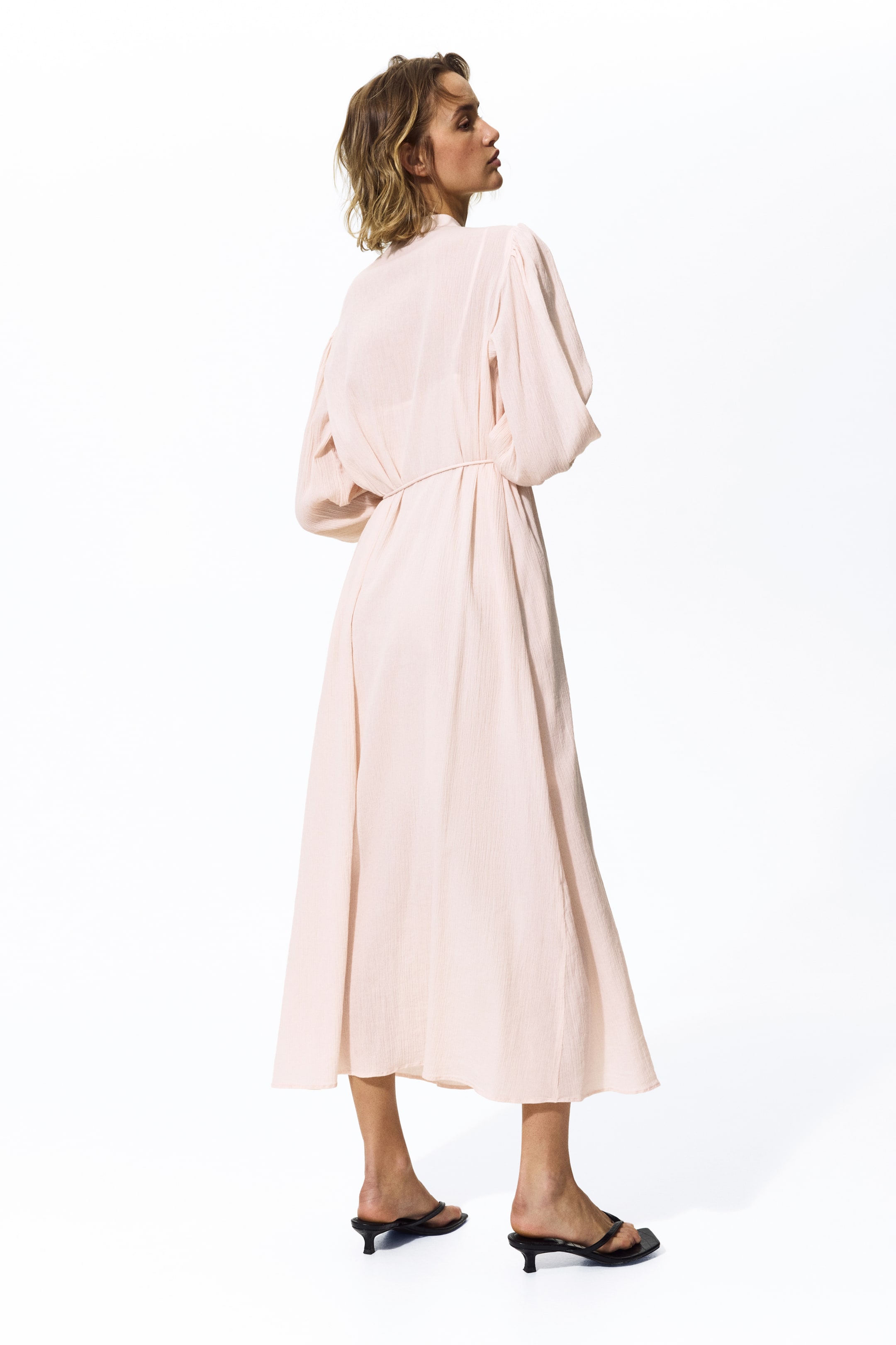 Длинное платье из хлопчатобумажной ткани жатого плетения с кружевной кокеткой спереди. Воротник-стойка, застежка на пуговицы спереди и кружевная планка, тонкий пояс на талии. Длинные рукава-фонарики с манжетами на пуговицах, прямой подол. Регулируемые бретели. Короткое платье-комбинация с V-образным вырезом.