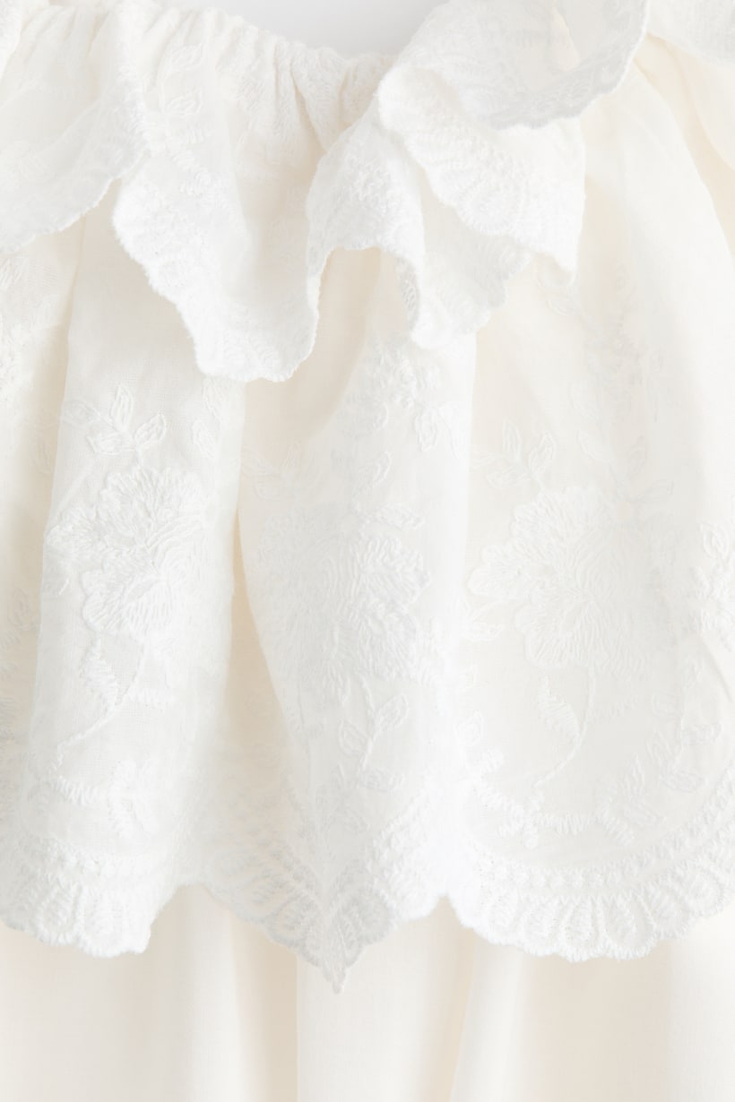 Длинное, объемное, расклешенное платье с открытыми плечами, с облегающим эластичным лифом, изготовленное из ткани, представляющей собой смесь вискозы и лиоцелла. Платье украшено двойными вышитыми оборками с волнистыми краями сверху и по низу. Подкладка из хлопка.