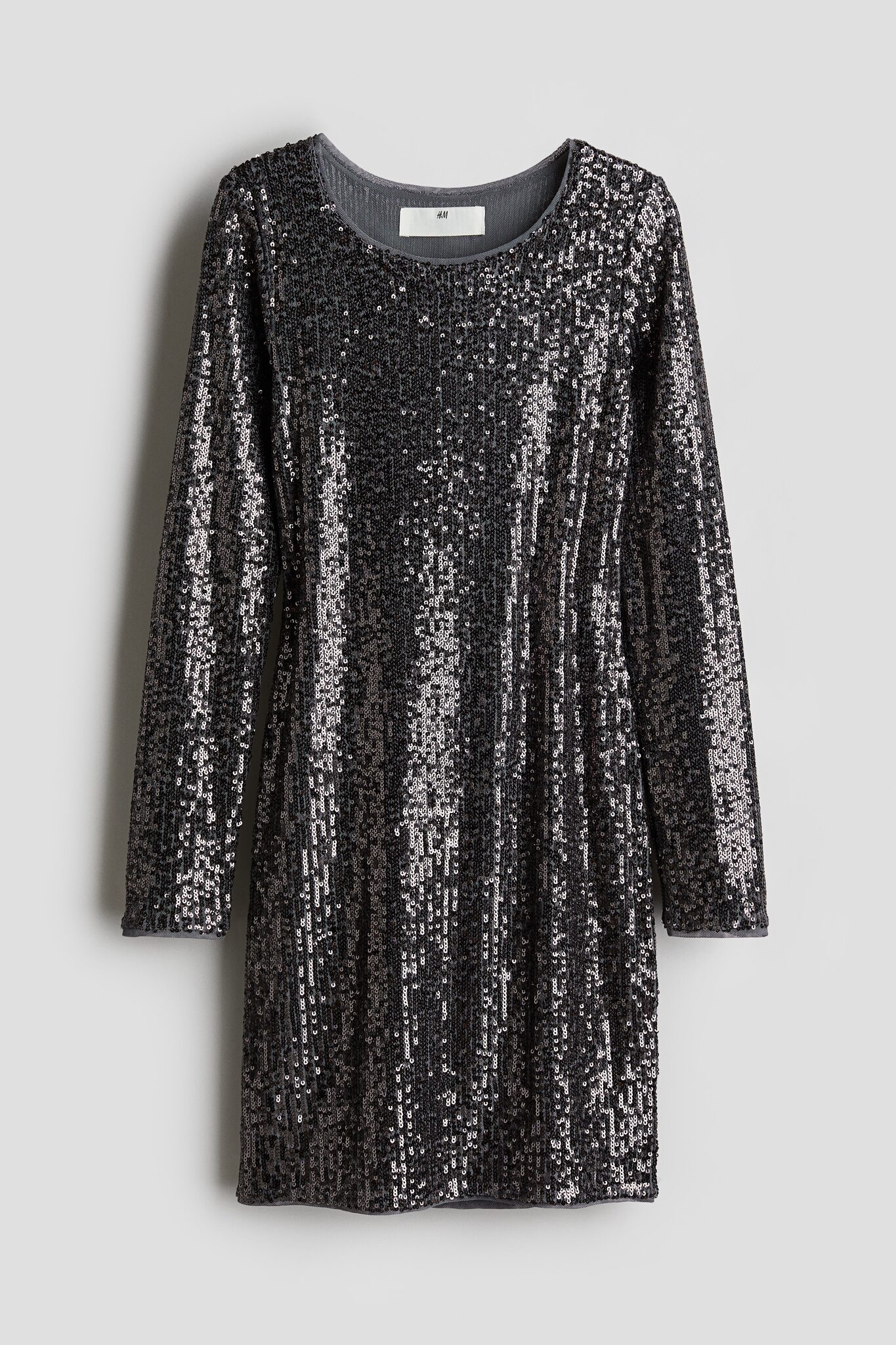 Платье с длинными рукавами, круглым вырезом и сеткой, расшитой пайетками. На подкладке.