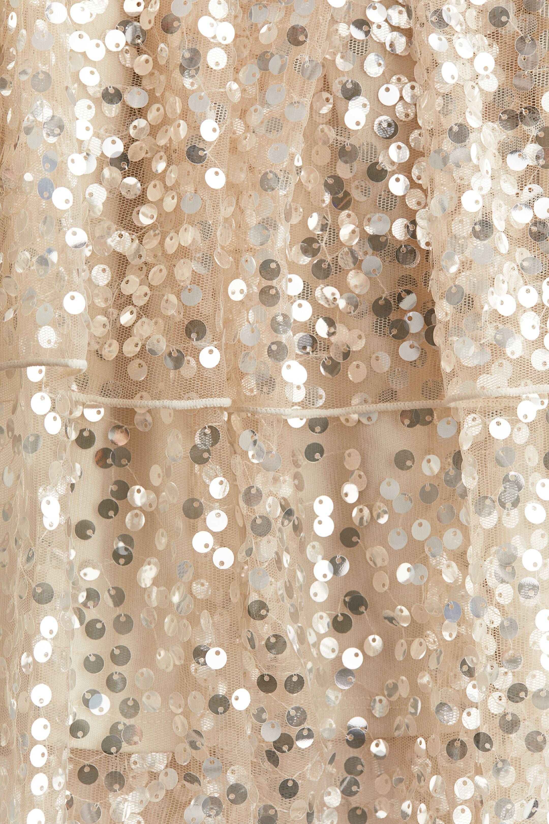 Платье без рукавов с плотным трикотажным лифом и юбкой из тюля с пайетками. Круглый вырез, многоярусная юбка на трикотажной подкладке и застежка на пуговицы сзади.