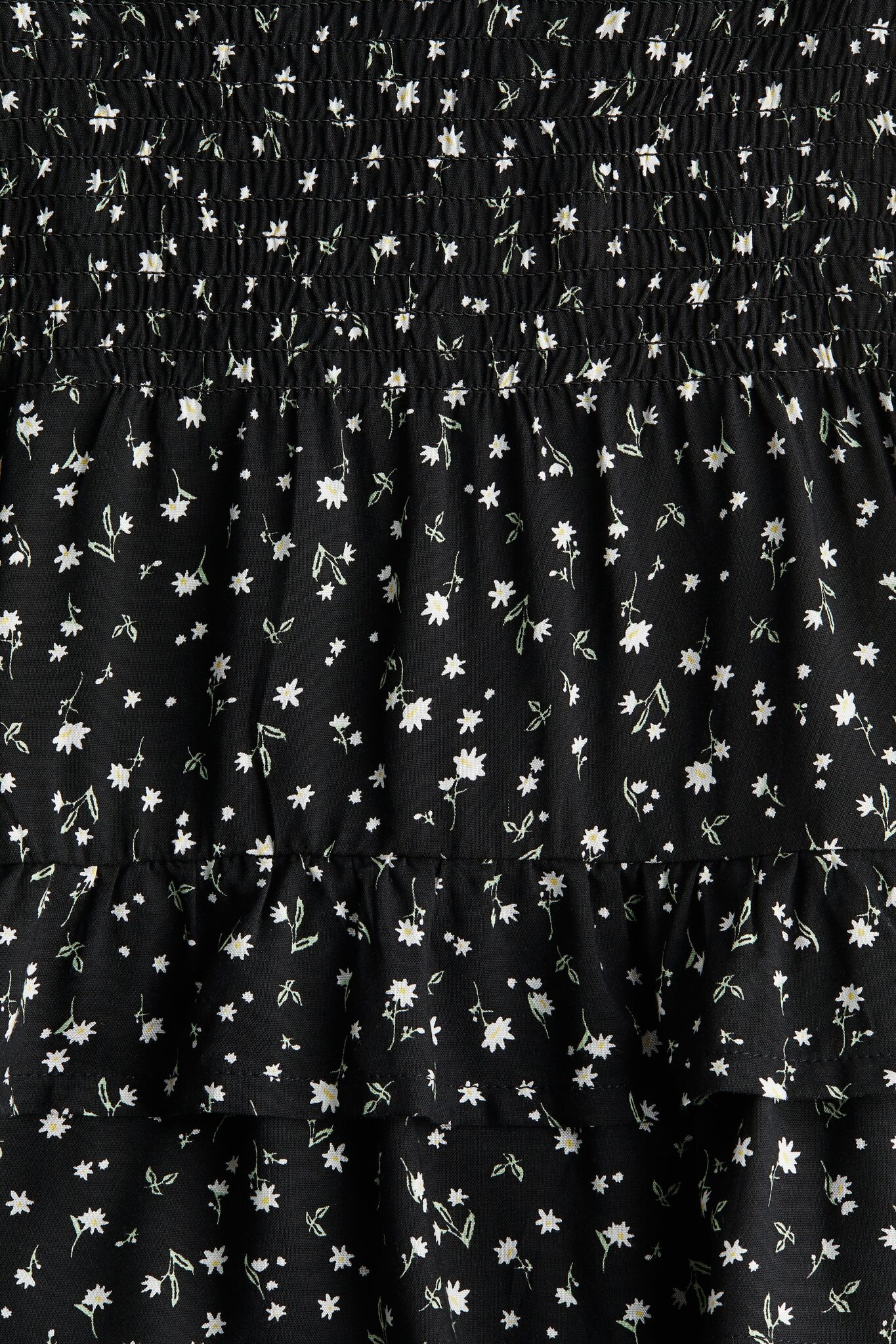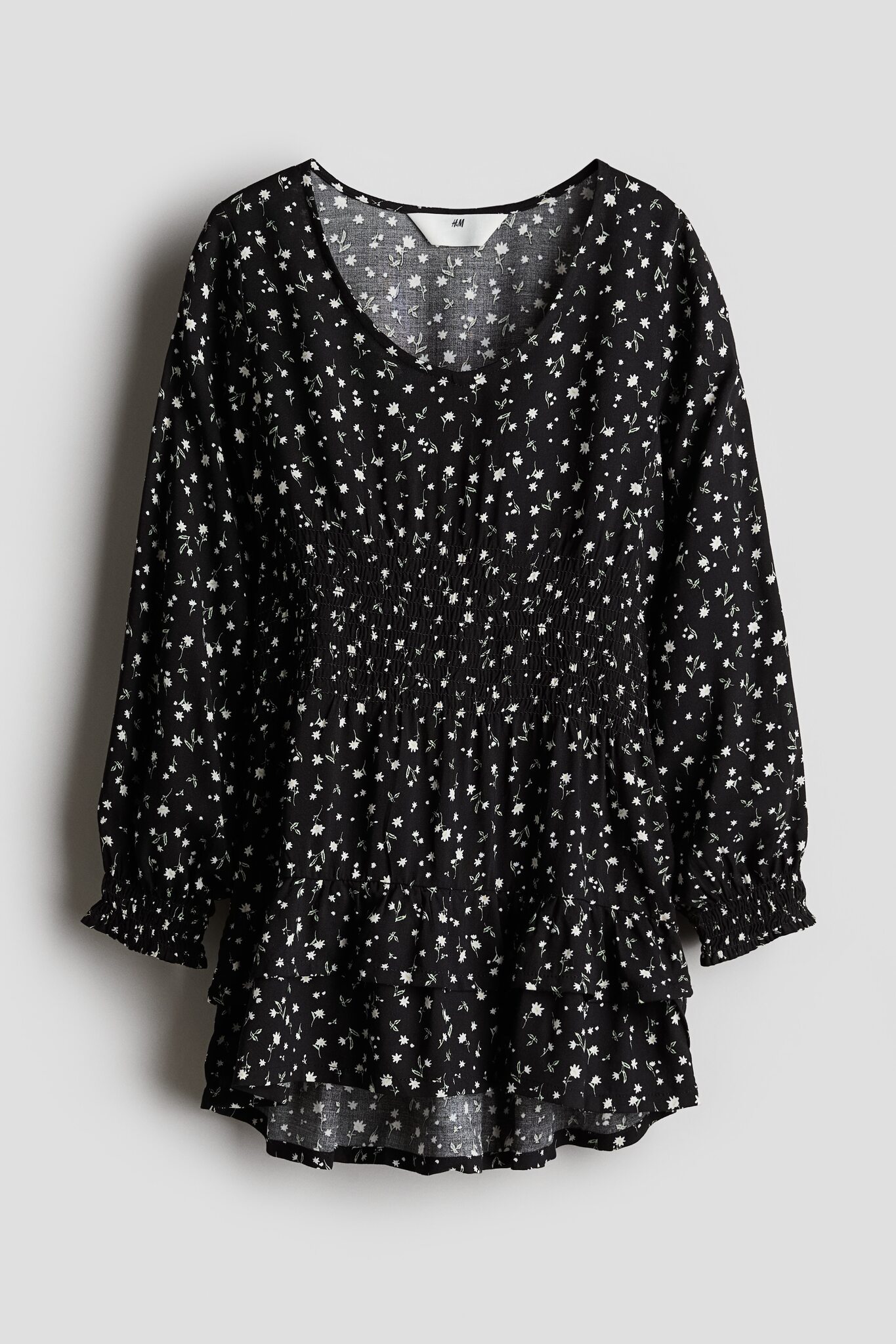 Платье из мягкой, воздушной вискозной ткани с принтом по всей поверхности. V-образный вырез, длинные рукава, сборки на талии и манжетах, оборка по подолу.