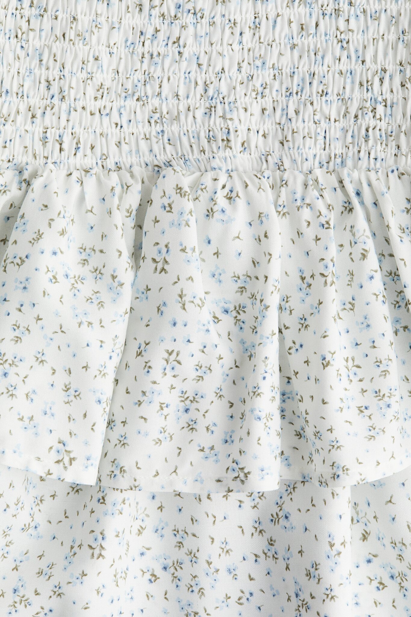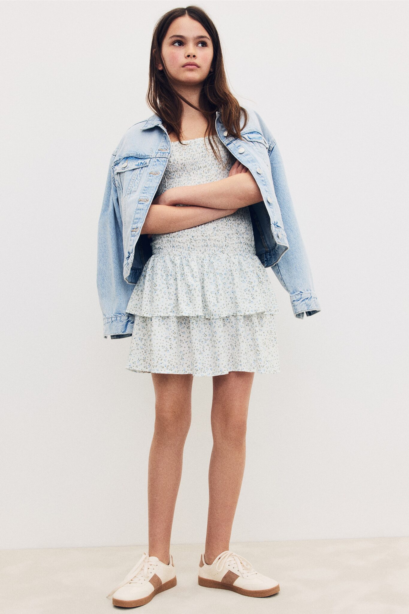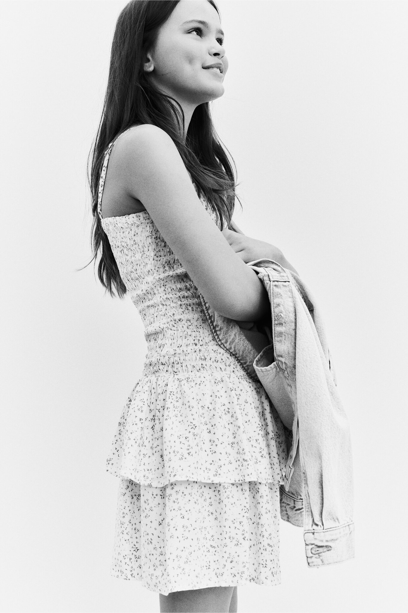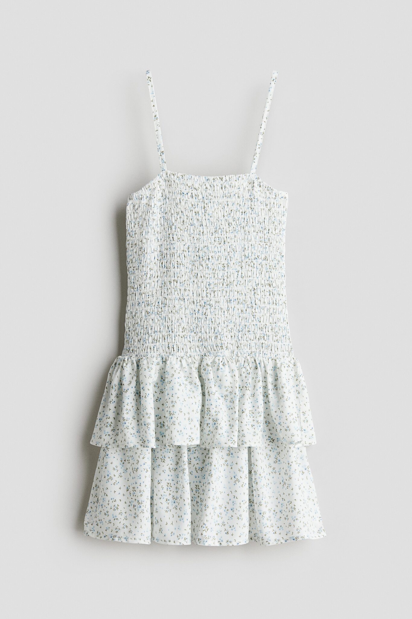 Платье из мягкой, воздушной ткани с присборенным лифом. Узкие регулируемые бретели, квадратный вырез, присборенные швы ниже талии и многоярусная юбка с воланами.
