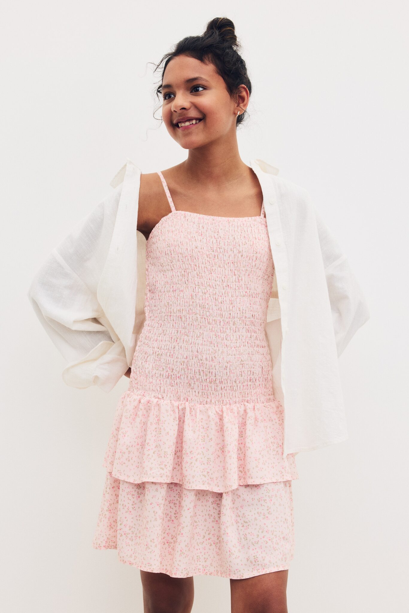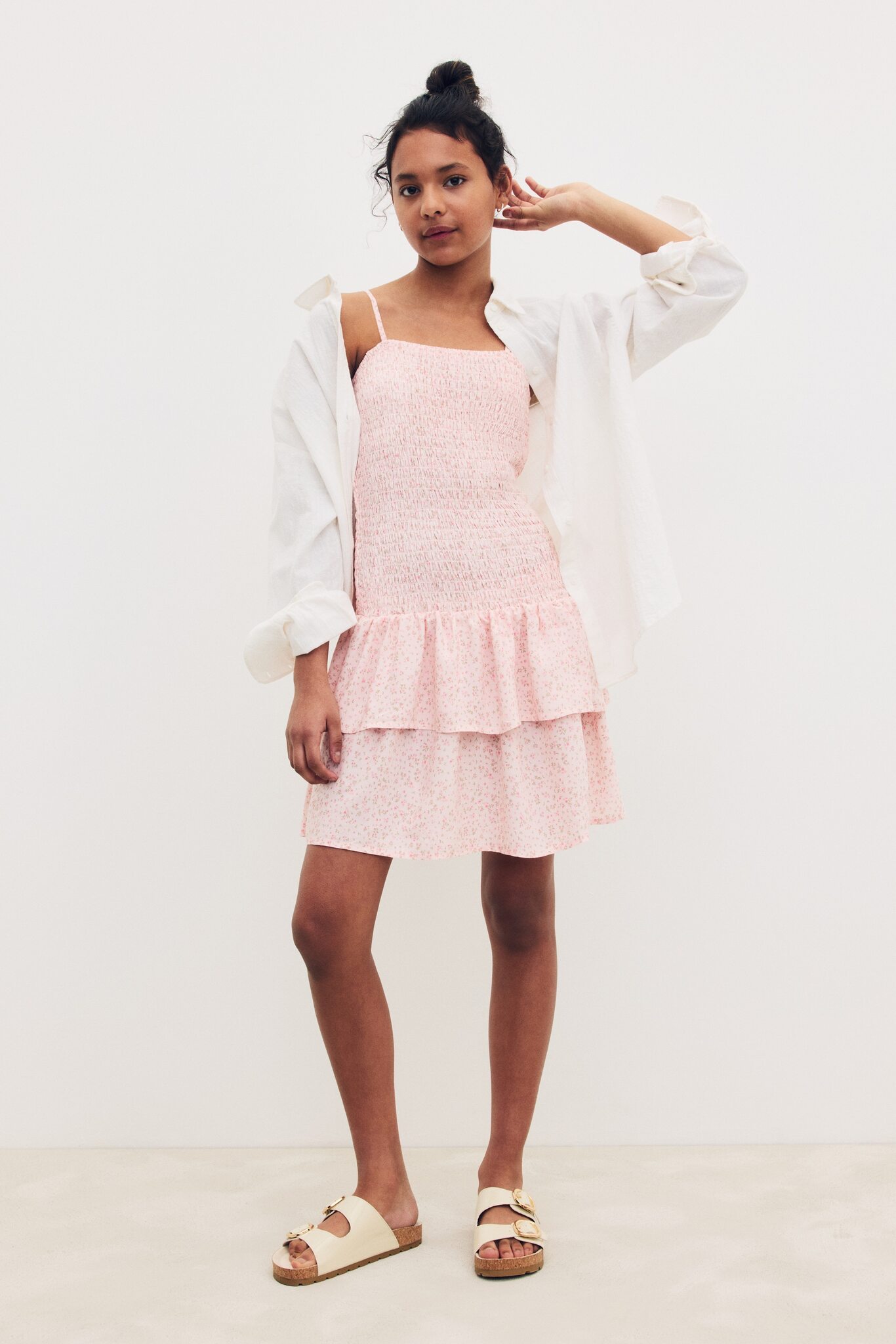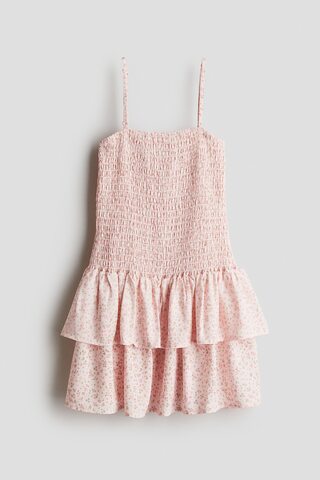 Платье из мягкой, воздушной ткани с присборенным лифом. Узкие регулируемые бретели, квадратный вырез, присборенные швы ниже талии и многоярусная юбка с воланами.