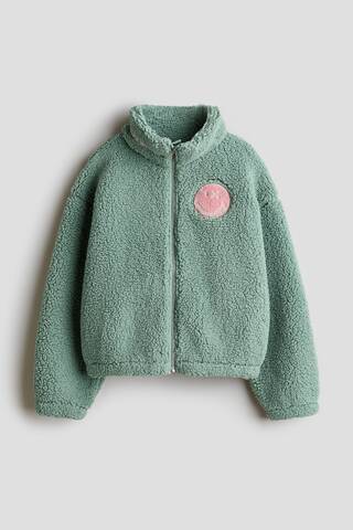 Мягкая плюшевая куртка со стоячим воротником, застежкой-молнией спереди, приспущенными плечами и боковыми карманами с кантом. Отделана тонкой трикотажной лентой по краям.