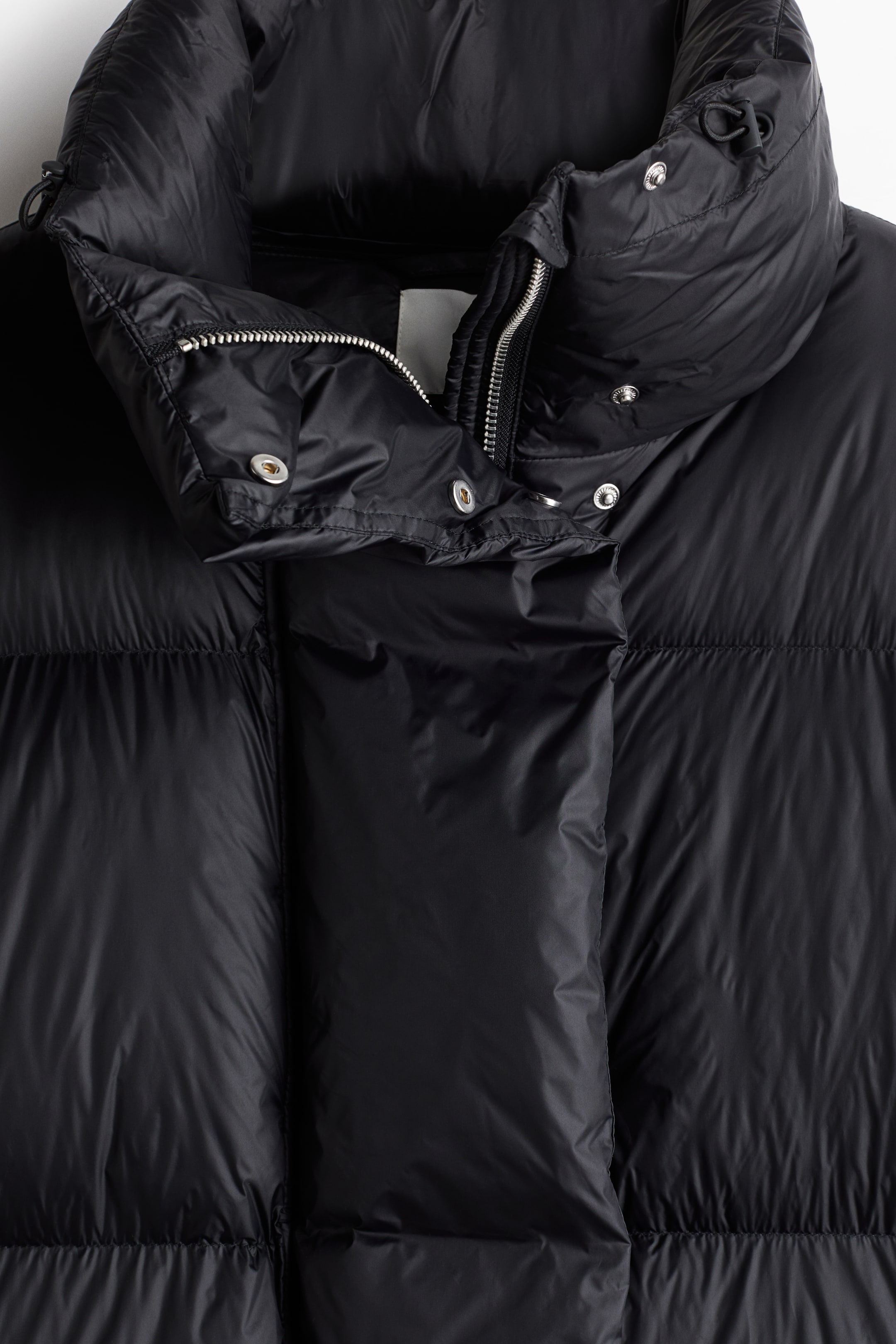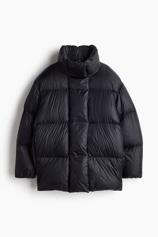 Нейлоновая куртка-пуховик свободного кроя с наполнителем из пуха и пера. Воротник-стойка, потайная ветрозащитная планка спереди на кнопках и молния с защитой подбородка, не раздражающей кожу. Спущенная линия плеч, длинные рукава и потайные боковые карманы. Эластичная кулиска на воротнике и подоле. На подкладке.