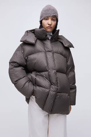 Нейлоновая куртка свободного кроя с наполнителем из пуха и пера. Съёмный капюшон с эластичной кулиской, воротник-стойка, застёжка-молния спереди и ветрозащитная планка на потайных кнопках. Боковые прорезные карманы с потайной молнией, эластичный низ с кулиской. На подкладке.