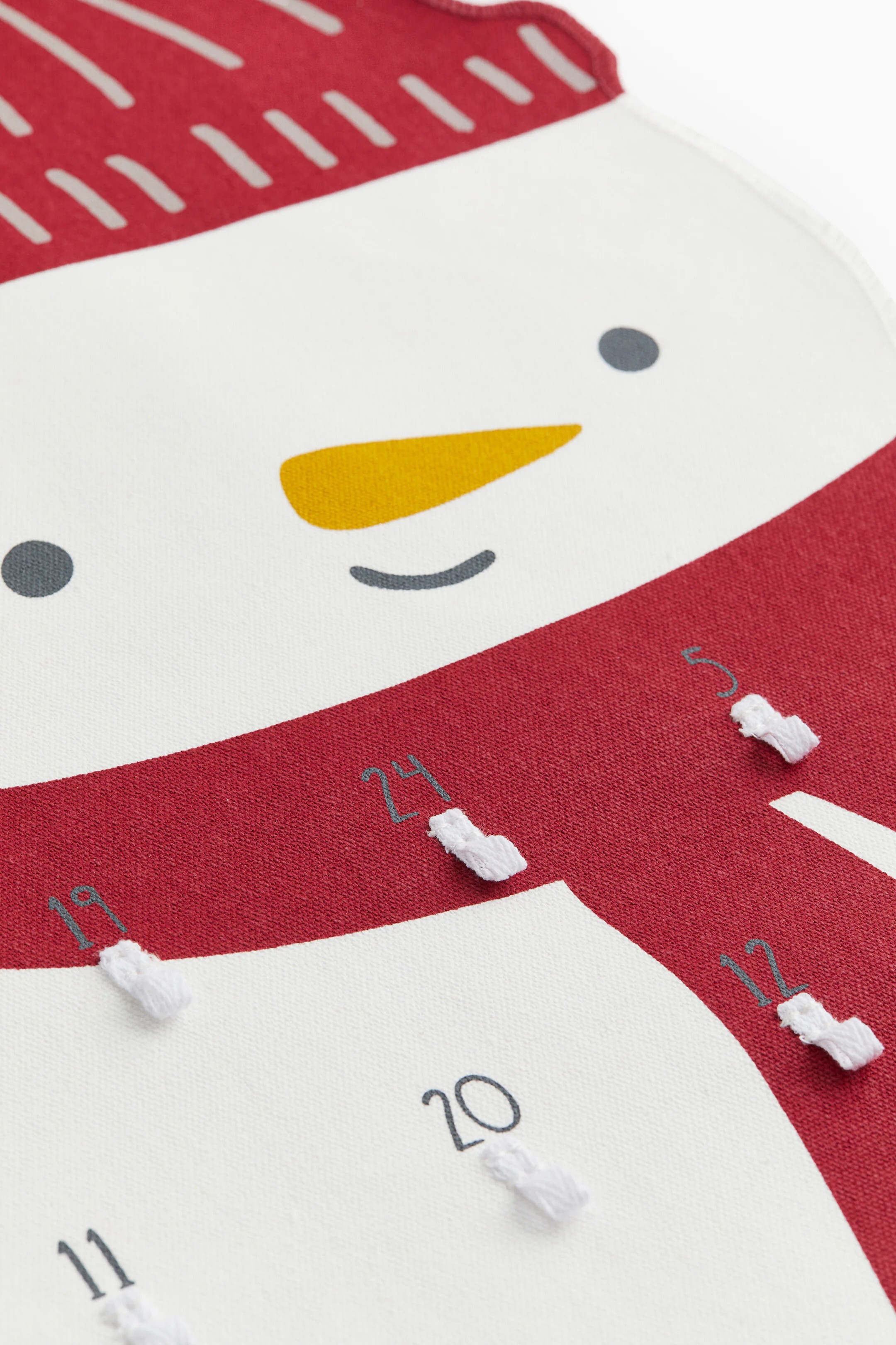 Адвент-календарь в форме снеговика из хлопковой смеси. Ширина в самой широкой части 39 см. Высота 72 см.