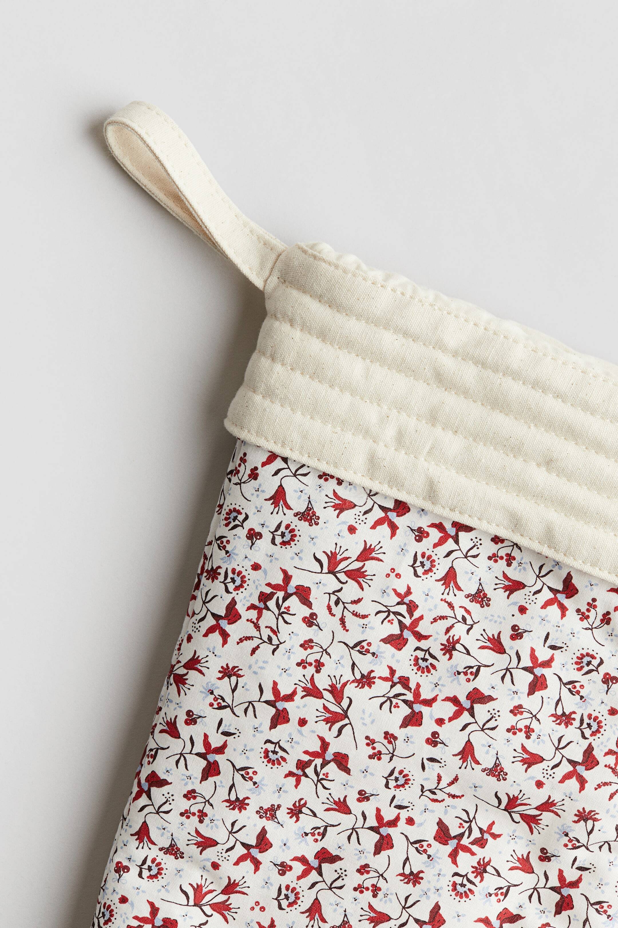 Рождественский чулок из узорчатой хлопчатобумажной ткани с отворотом, стёганым краем и петелькой наверху. Ширина 31 см. Длина 42 см.