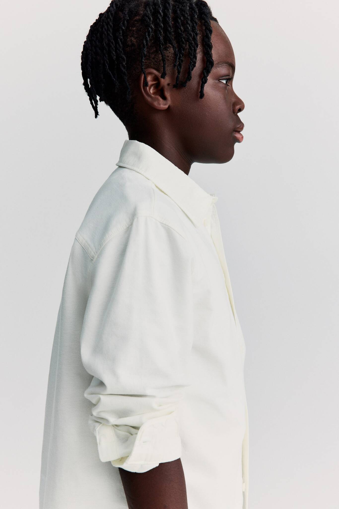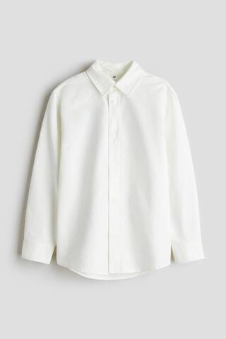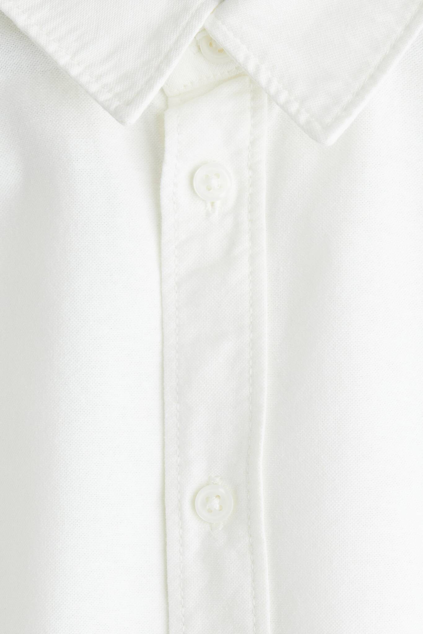 Рубашка с длинными рукавами из мягкой хлопковой ткани с отложным воротником, пуговицами спереди, плиссированной кокеткой сзади, манжетами на пуговицах и закругленным низом.