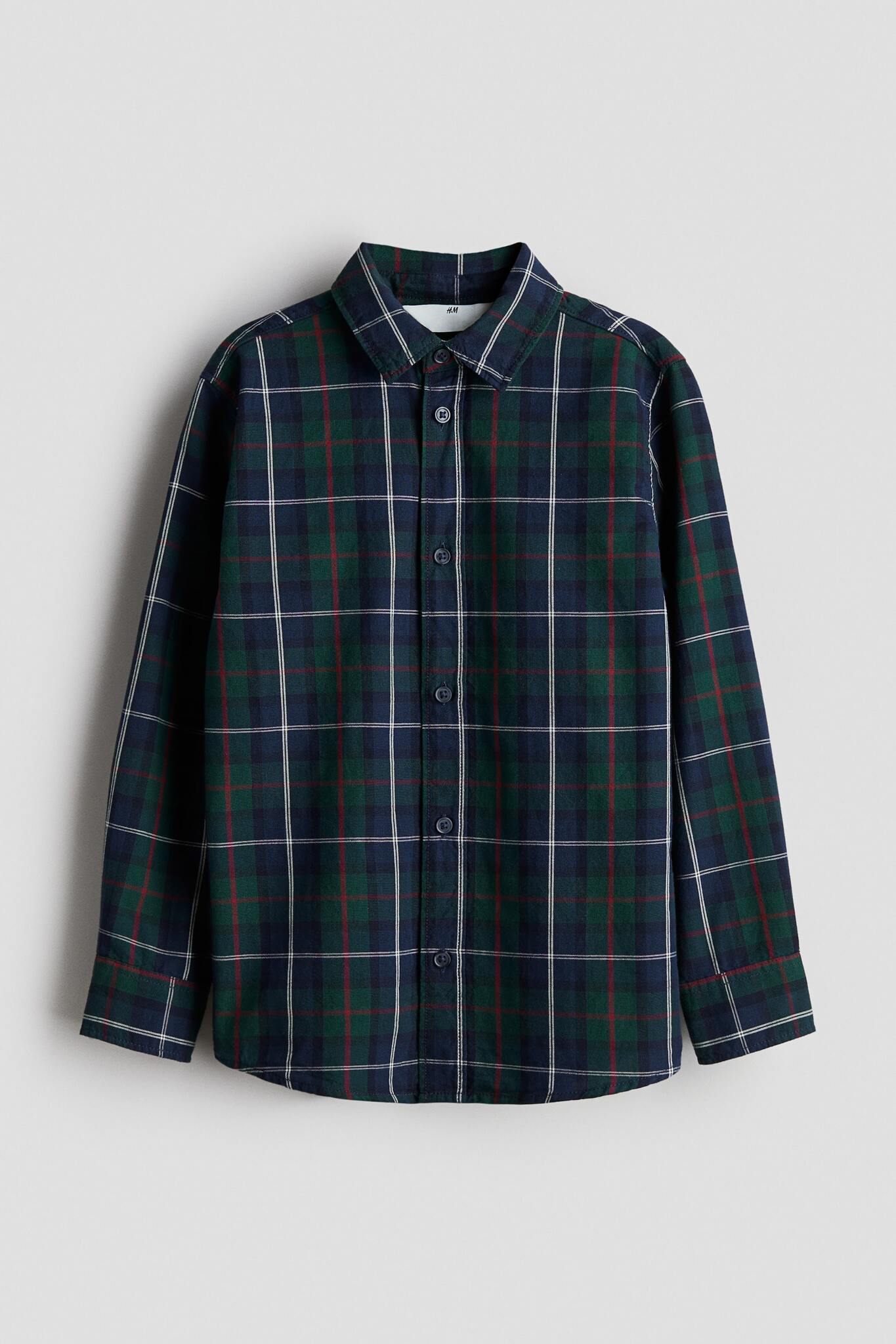 Рубашка с длинными рукавами из мягкой хлопковой ткани с отложным воротником, пуговицами спереди, плиссированной кокеткой сзади, манжетами на пуговицах и закругленным низом.