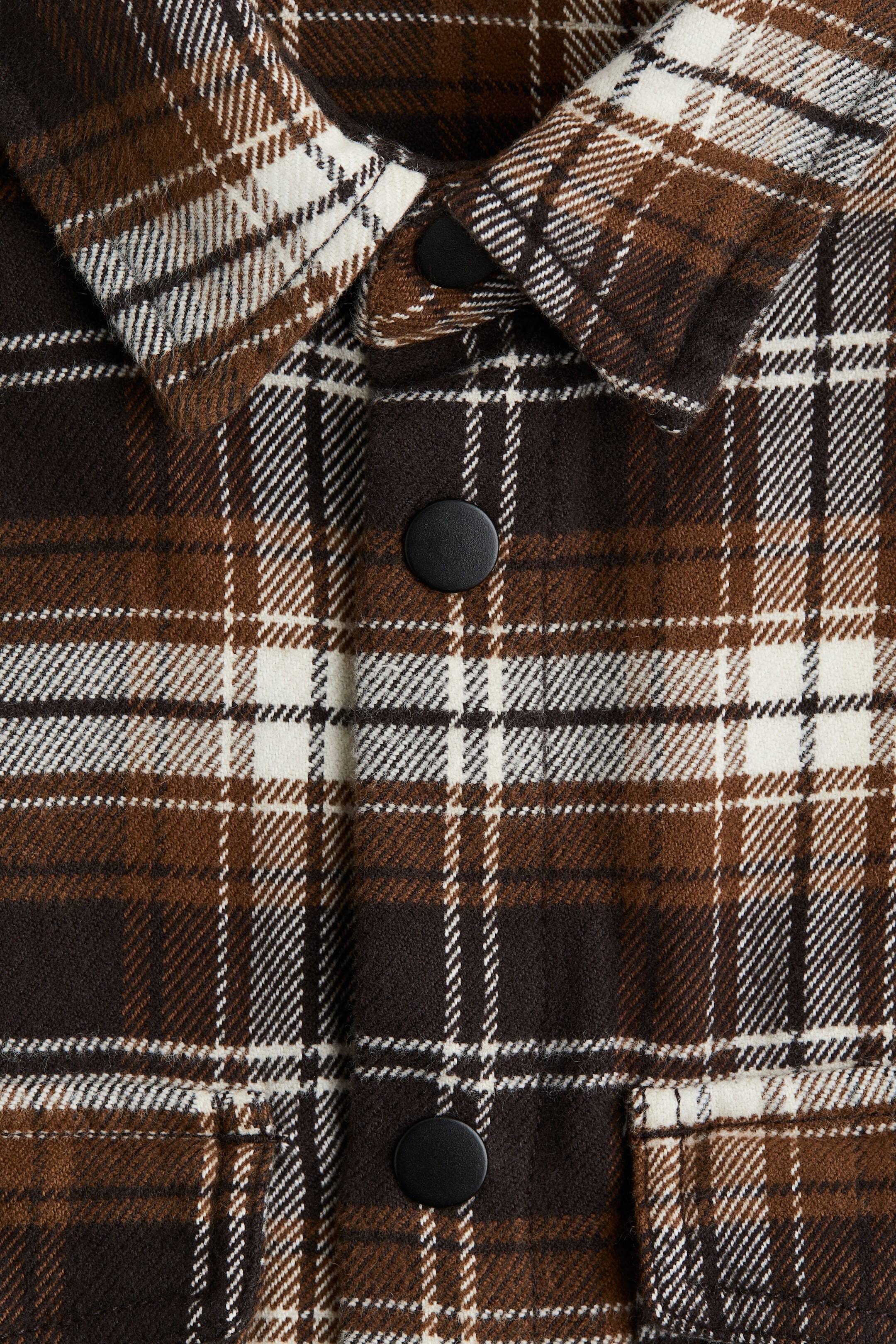 Свободная рубашка-рубашка из мягкой хлопковой фланели с отложным воротником, застежкой на пуговицы спереди, нагрудными карманами с клапанами на потайных кнопках, кокеткой сзади, длинными рукавами и манжетами на пуговицах.