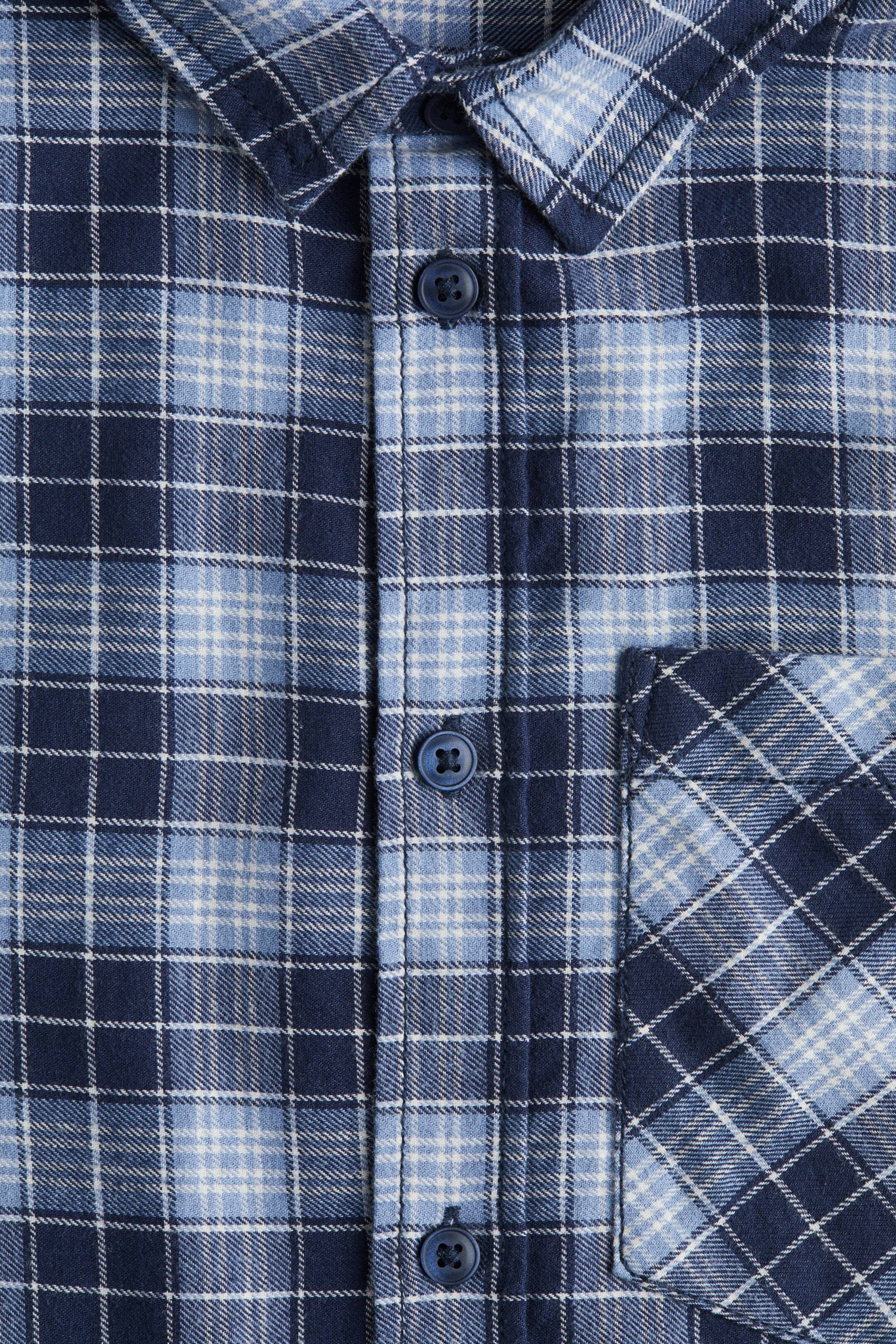 Рубашка из мягкой хлопковой фланели с отложным воротником, застёжкой на пуговицы спереди и кокеткой сзади. Спущенная линия плеча, длинные рукава с манжетами на пуговицах и накладной нагрудный карман. Слегка закруглённый подол.