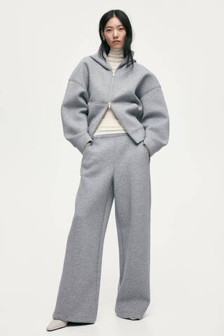 Брюки с эффектом неопрена, широкие штанины. Высокая талия, молния сбоку и косые карманы.