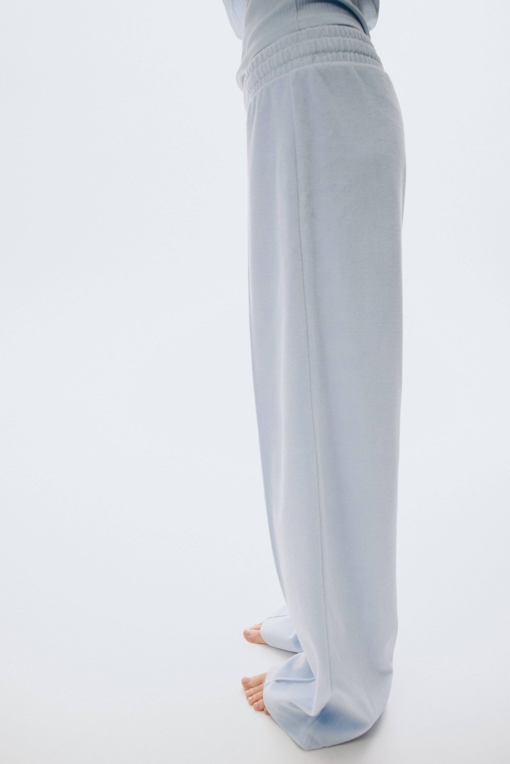 Широкие брюки-джоггеры из мягкого велюра с эластичной талией на шнурке и зашитыми стрелками спереди.