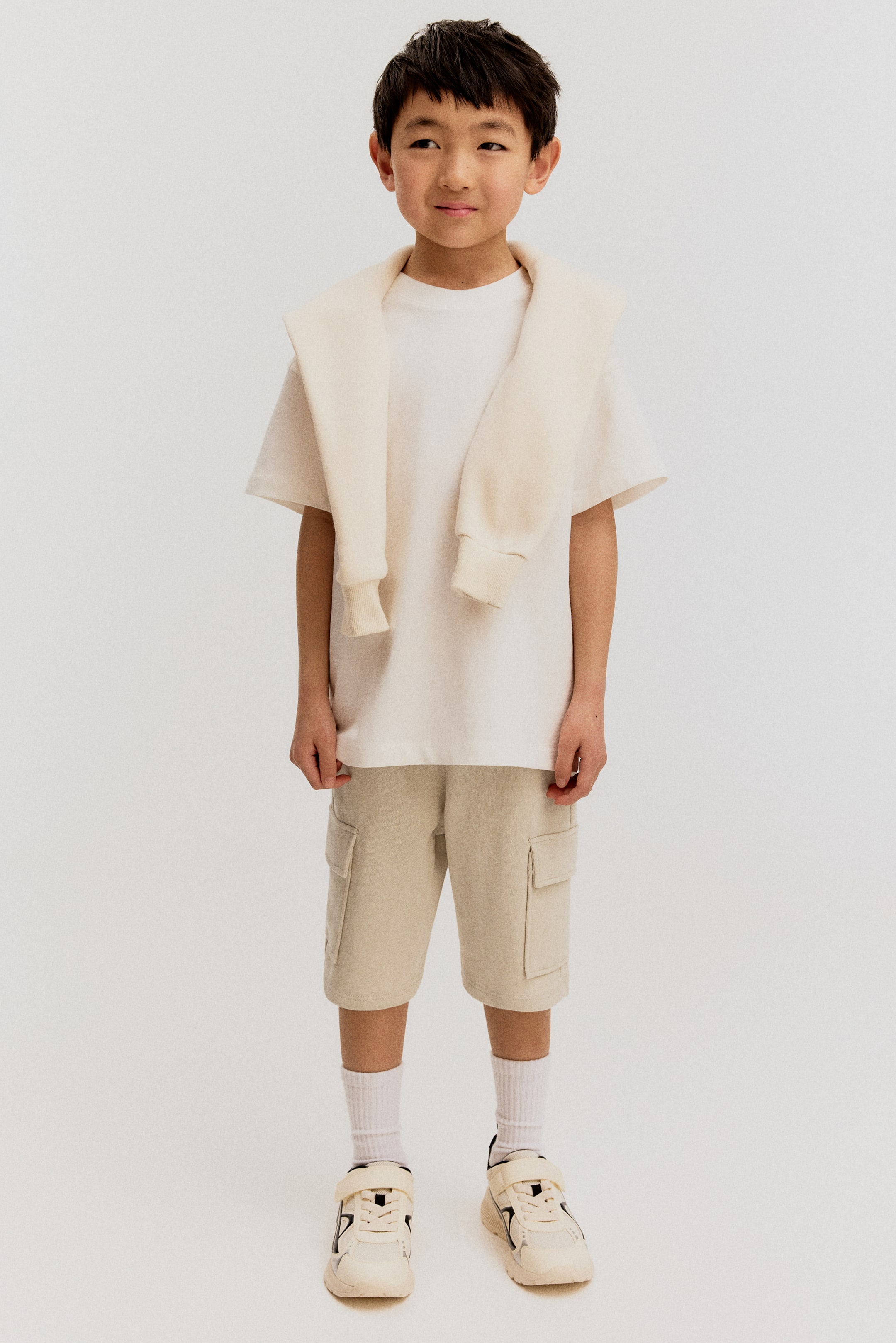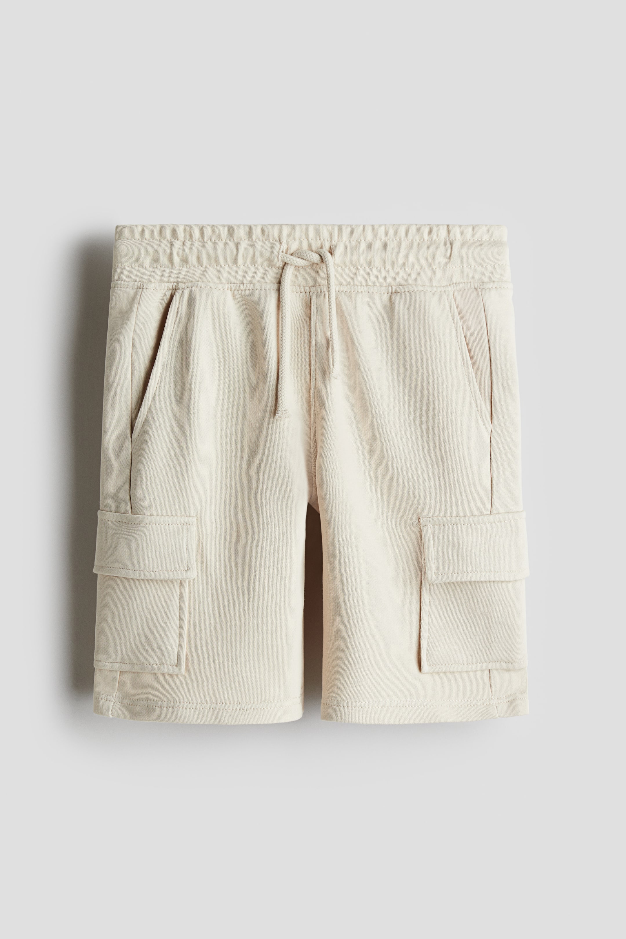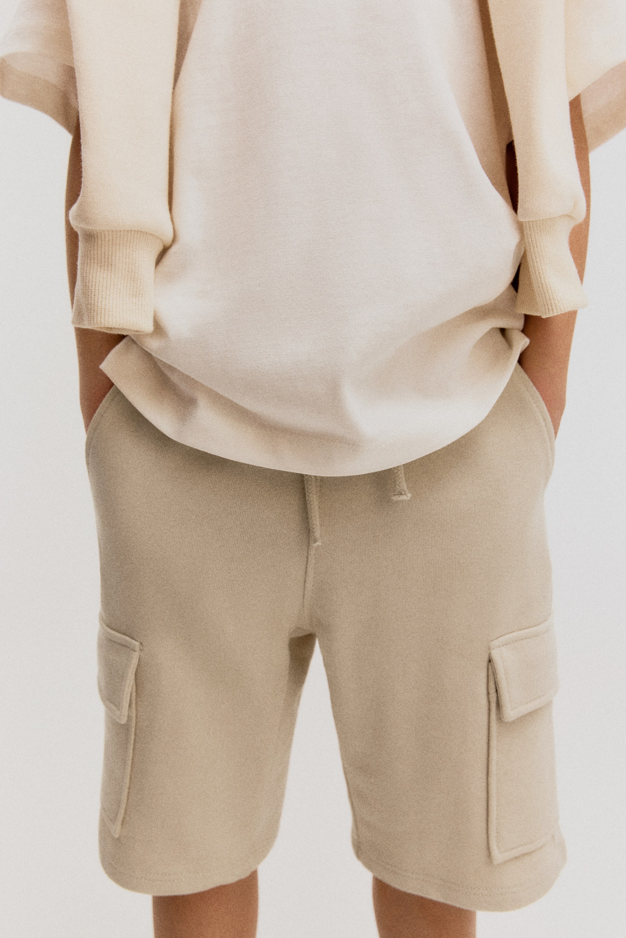 Карго-шорты длиной до колена, изготовленные из мягкой флисовой ткани. Имеют эластичный пояс со шнурком, декоративную планку, диагональные передние карманы и накладные карманы на штанинах.