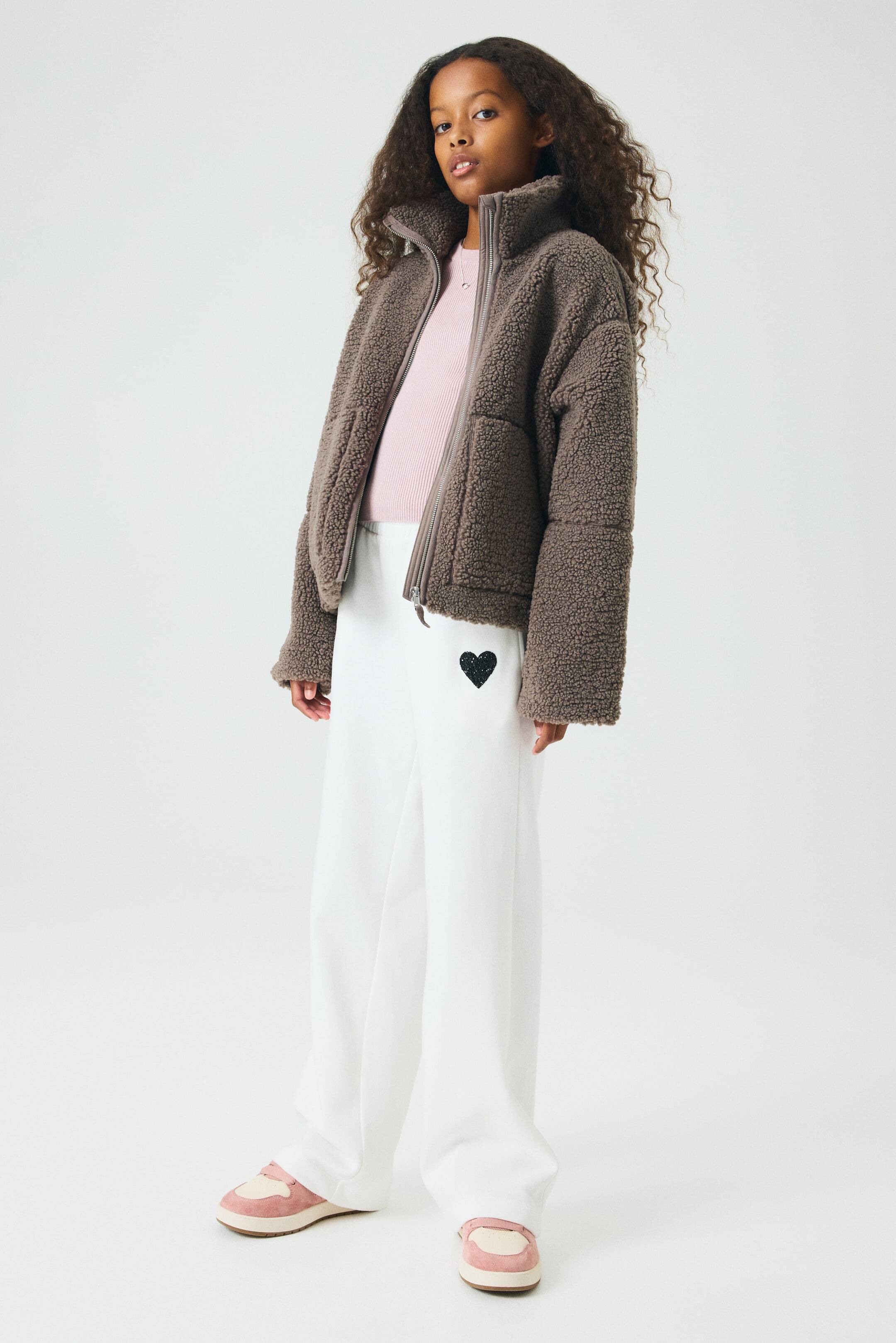 Джоггеры из мягкой толстовочной ткани на флисовой подкладке с небольшим рисунком спереди. Они имеют закрытый пояс на шнурке, потайные боковые карманы и прямые, широкие брючины.