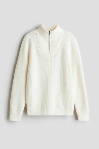 Мягкий свитер из трикотажной резинки. Воротник-стойка, застёжка-молния с защитой подбородка сверху, не раздражающей кожу. Длинные рукава, воротник, манжеты и подол выполнены в рубчик.