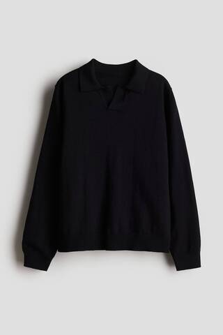 Тонкий трикотажный свитер-поло с длинными рукавами из мягкого хлопка, V-образным вырезом, ребристыми манжетами и подолом.