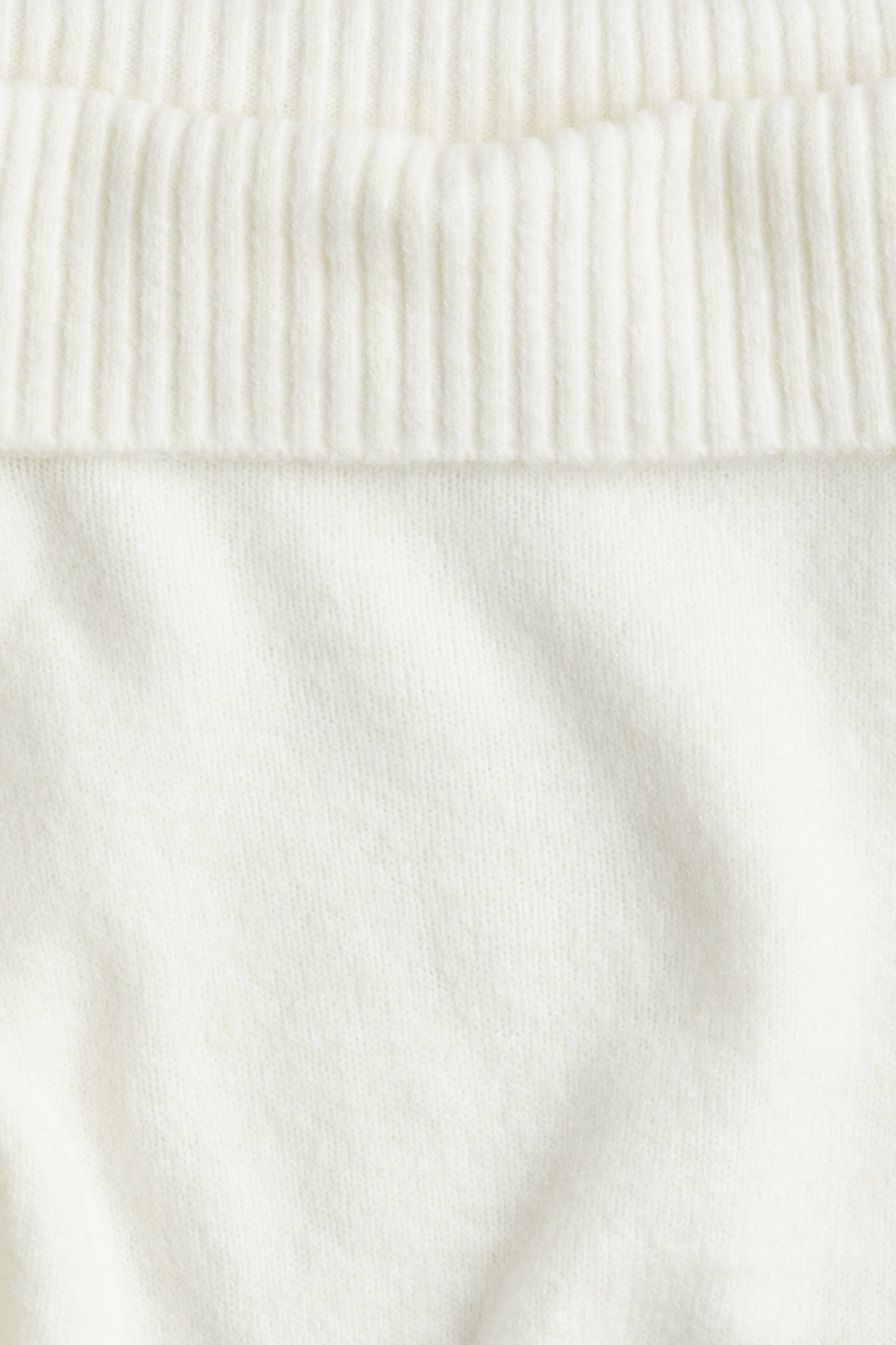 Мягкий свитер с открытыми плечами и длинными рукавами из мягкой пряжи с широким рельефным верхом и резинкой на манжетах и подоле.
