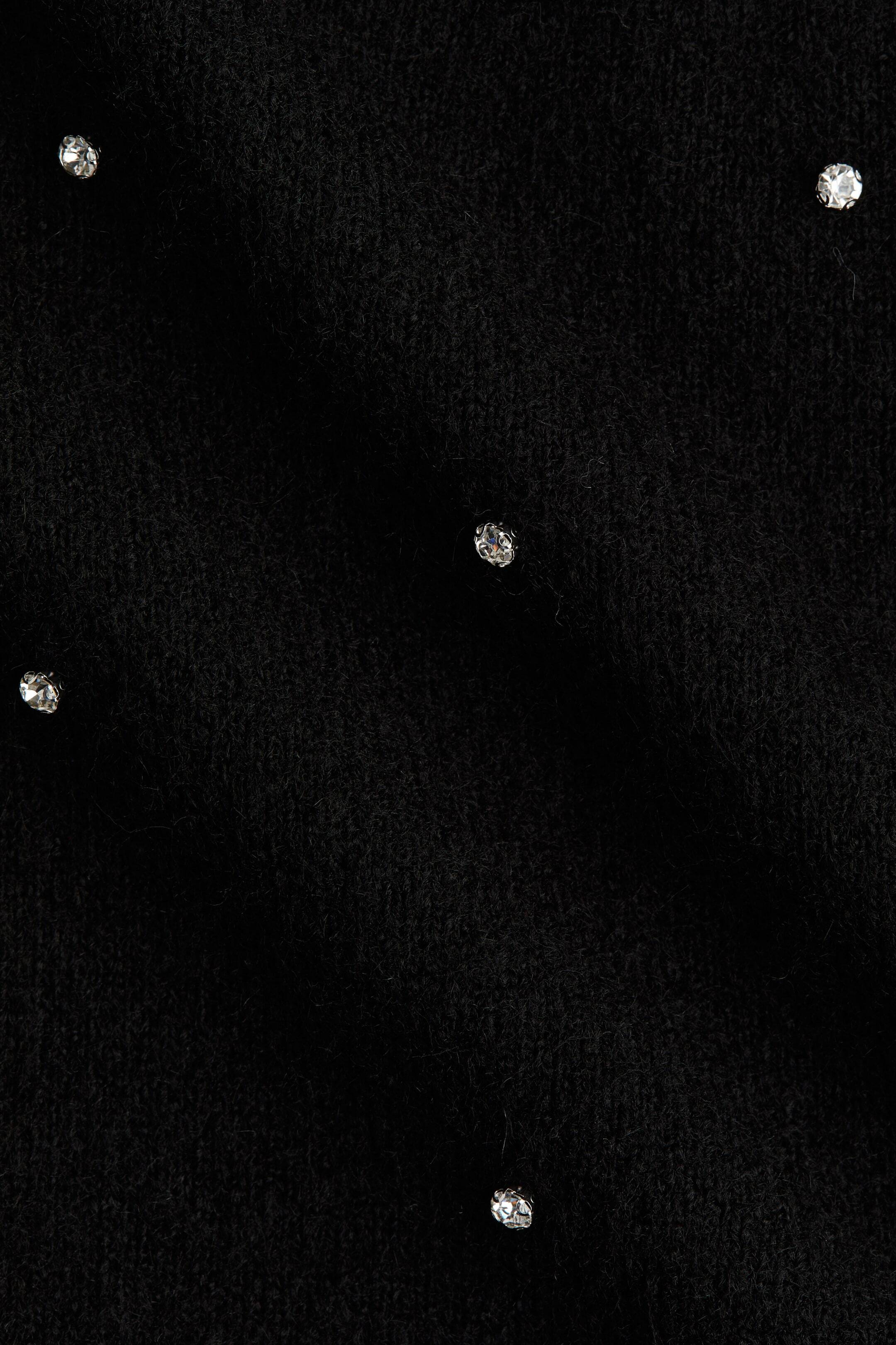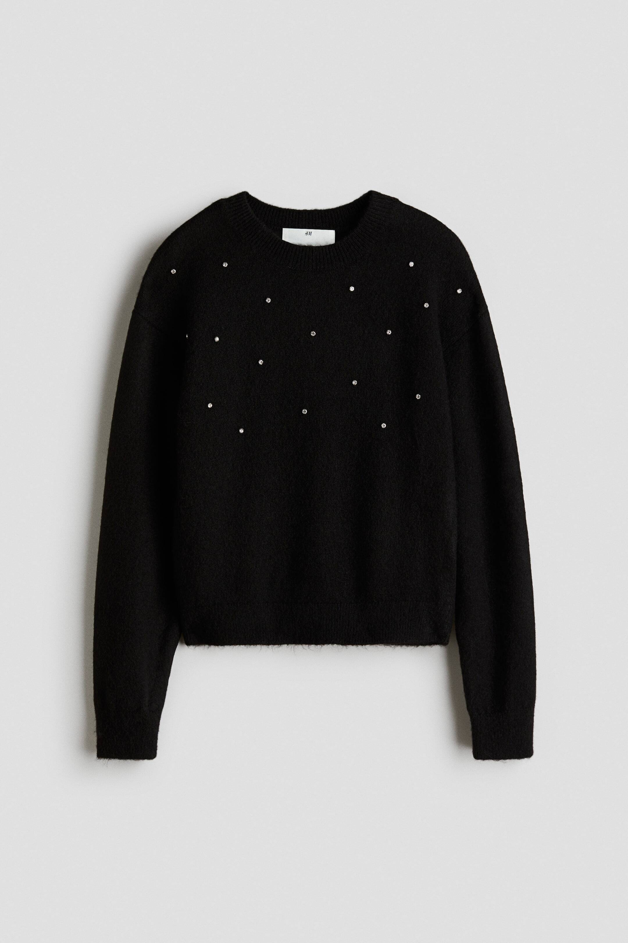 Свободный свитер тонкой вязки из мягкой ткани с вышивкой стразами сверху. Круглый вырез горловины, спущенная линия плеча, резинка по горловине, манжетам и подолу.