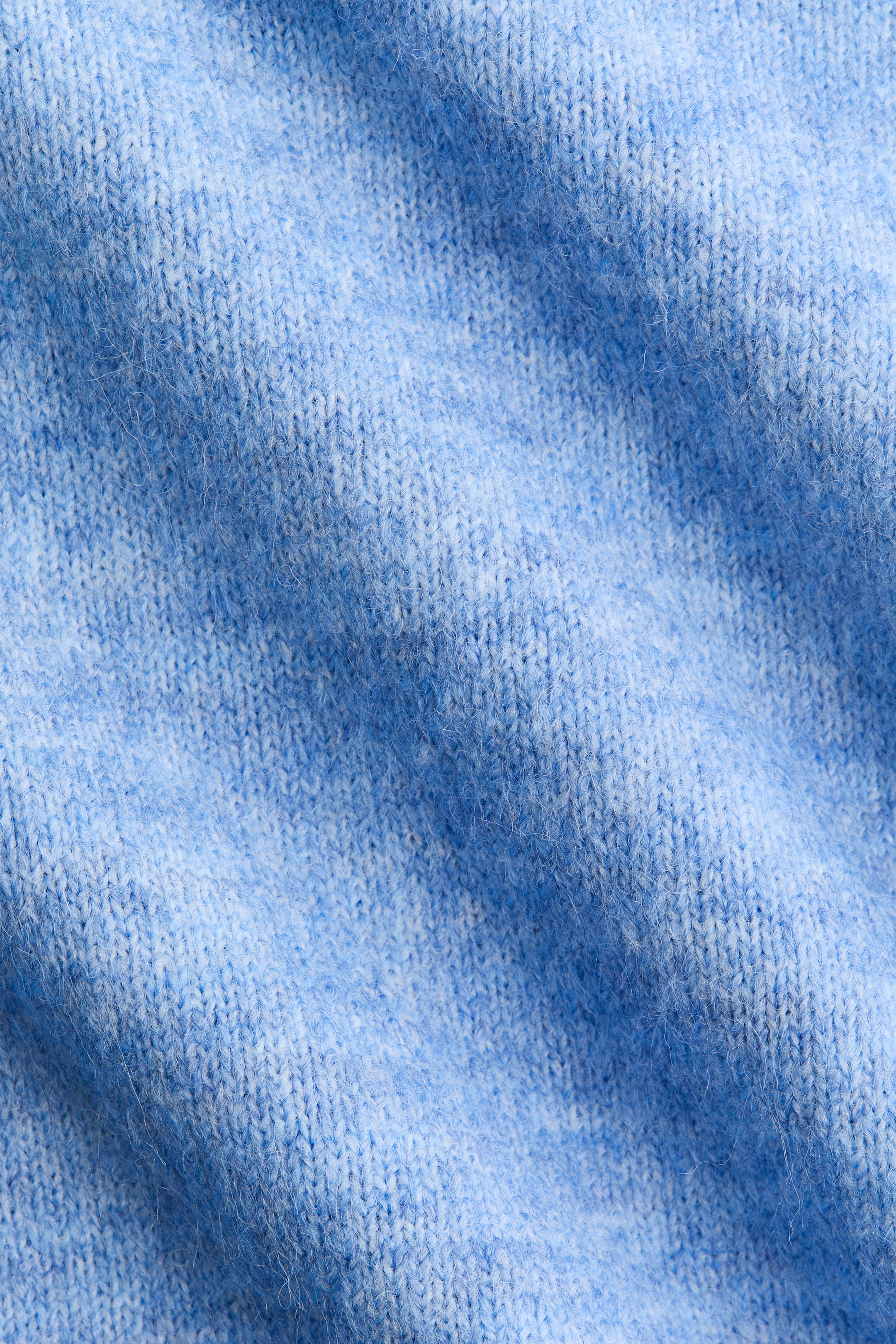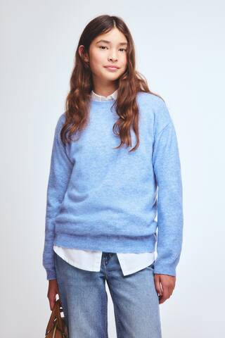 Мягкий вязаный свитер с круглым вырезом, приспущенными плечами, длинными рукавами и свободным кроем, украшенный ребристой отделкой на манжетах и подоле.
