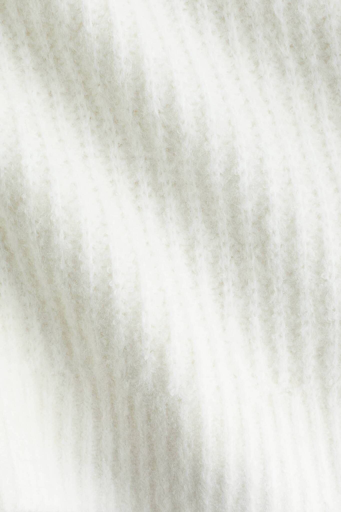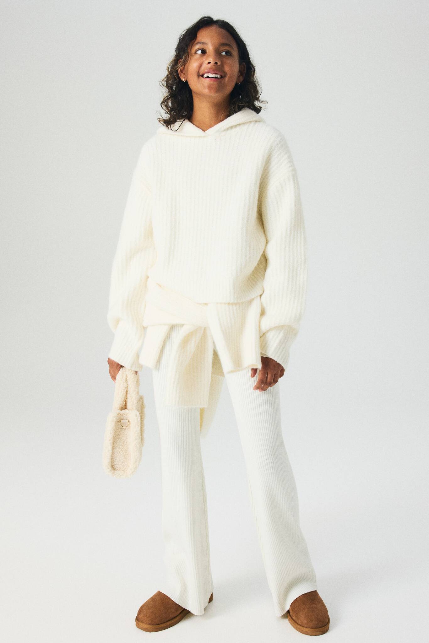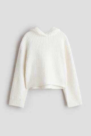 Свободный, мягкий свитер из трикотажной ткани в рубчик, с капюшоном-запахом, спущенной линией плеча и длинными рукавами.