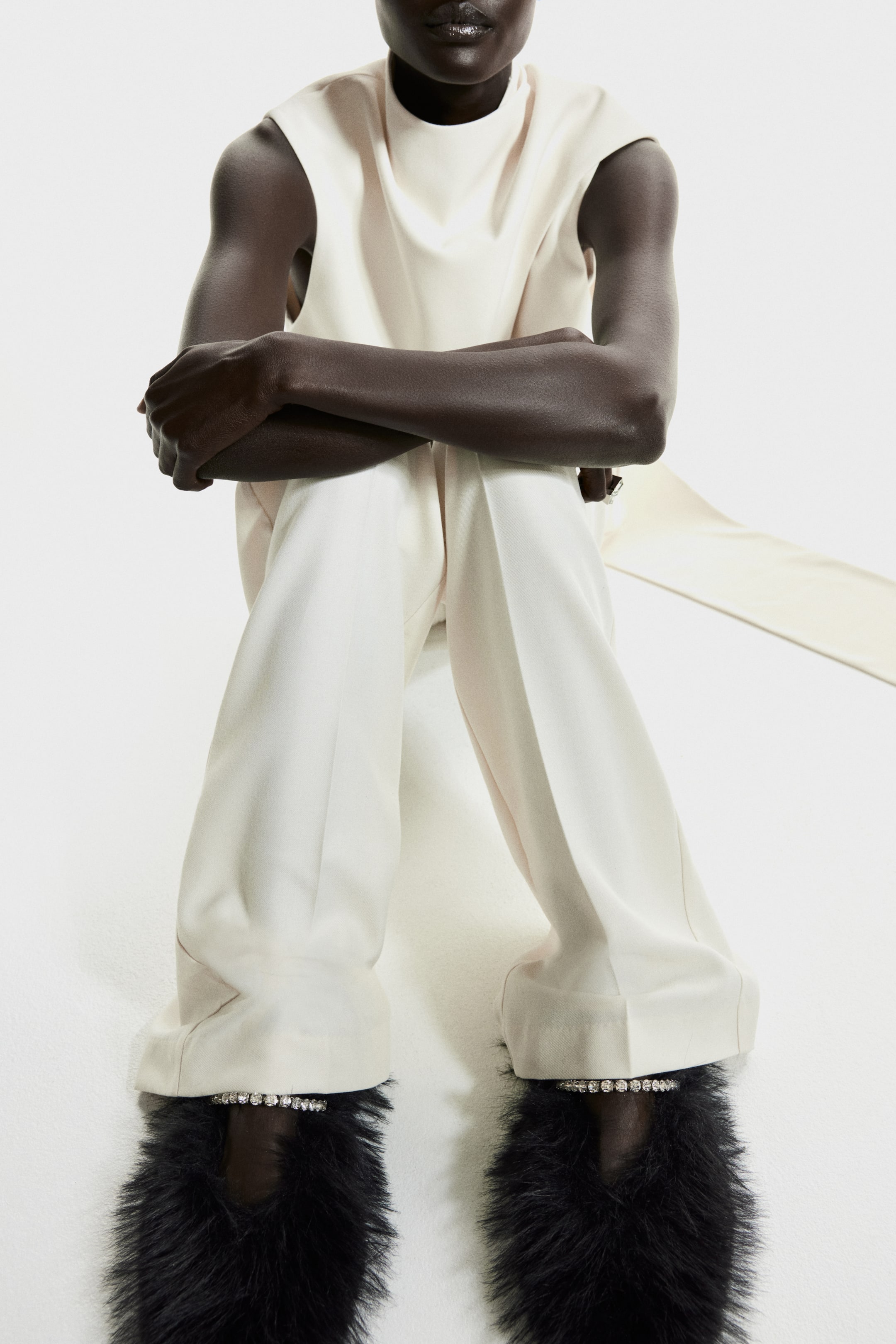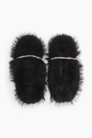 Мягкие тапочки из искусственного меха на атласной подкладке. Эластичный ремешок на подъёме, украшенный стразами.