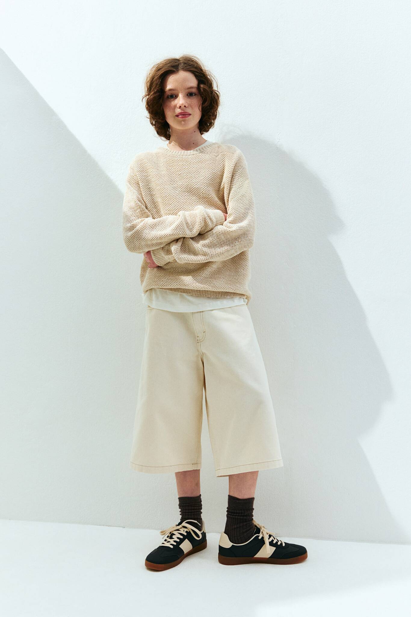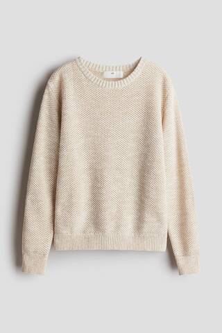 Свободный свитер текстурной вязки из смеси хлопка и льна. Круглый вырез с резинкой, спущенная линия плеча и тонкая резинка на манжетах и подоле.