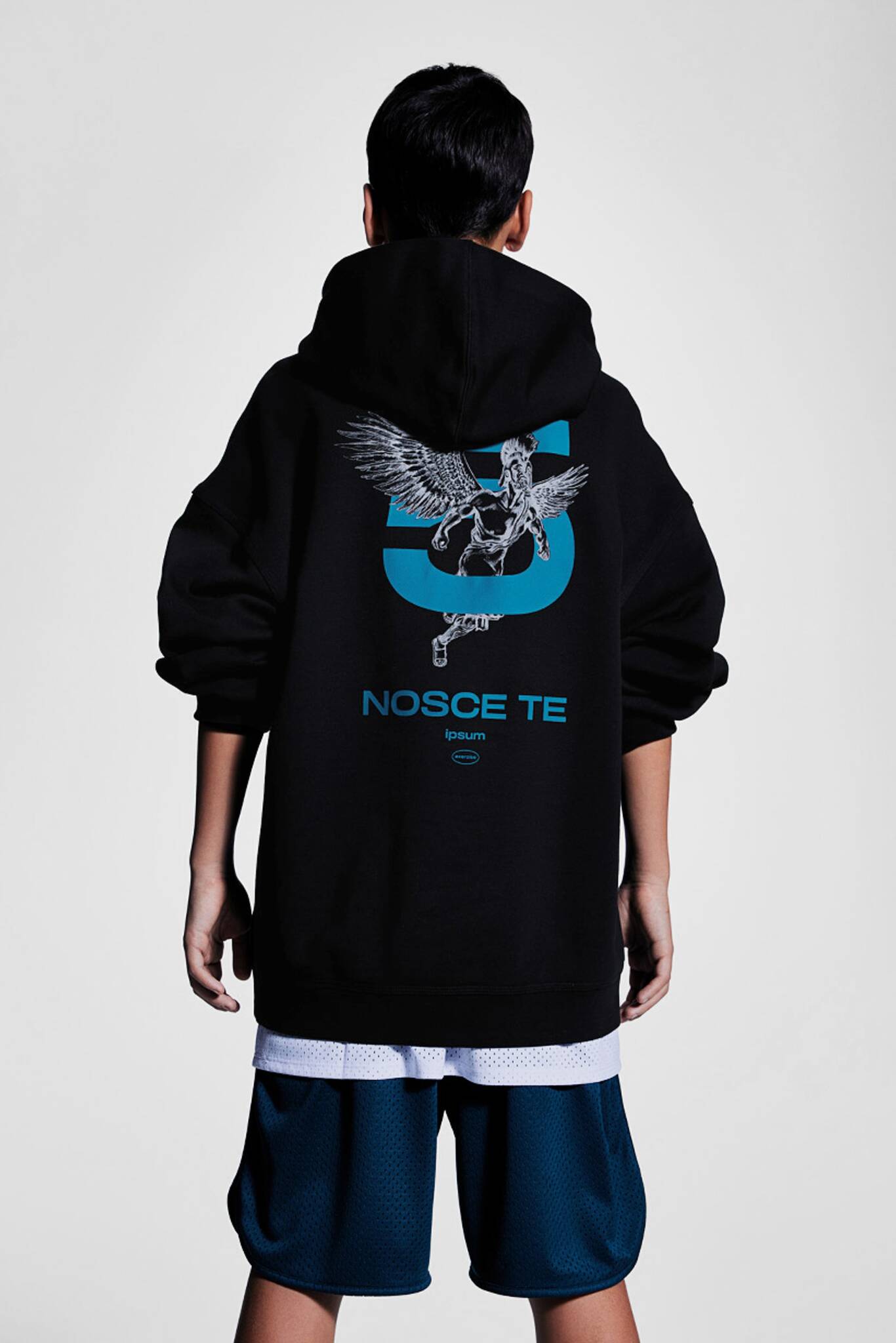Свободная спортивная толстовка из хлопчатобумажной ткани с капюшоном на подкладке, спущенной линией плеч, длинными рукавами, карманом-кенгуру и широкой резинкой на манжетах и подоле.