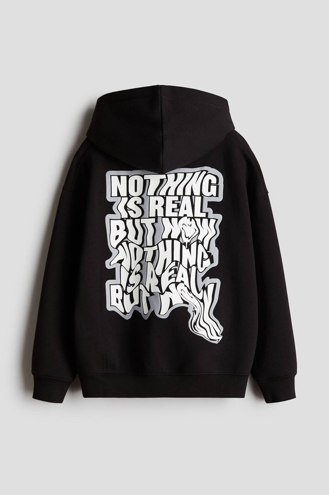 Свободный крой с капюшоном из трикотажной ткани с вышитым рисунком спереди и мягкой флисовой подкладкой. Капюшон на трикотажной подкладке с запахом спереди, заниженные плечи и карман-кенгуру спереди. Длинные рукава с резинкой на манжетах и подоле.