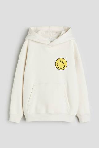 Свободный крой с капюшоном из трикотажной ткани с вышитым рисунком спереди и мягкой флисовой подкладкой. Капюшон на трикотажной подкладке с запахом спереди, заниженные плечи и карман-кенгуру спереди. Длинные рукава с резинкой на манжетах и подоле.