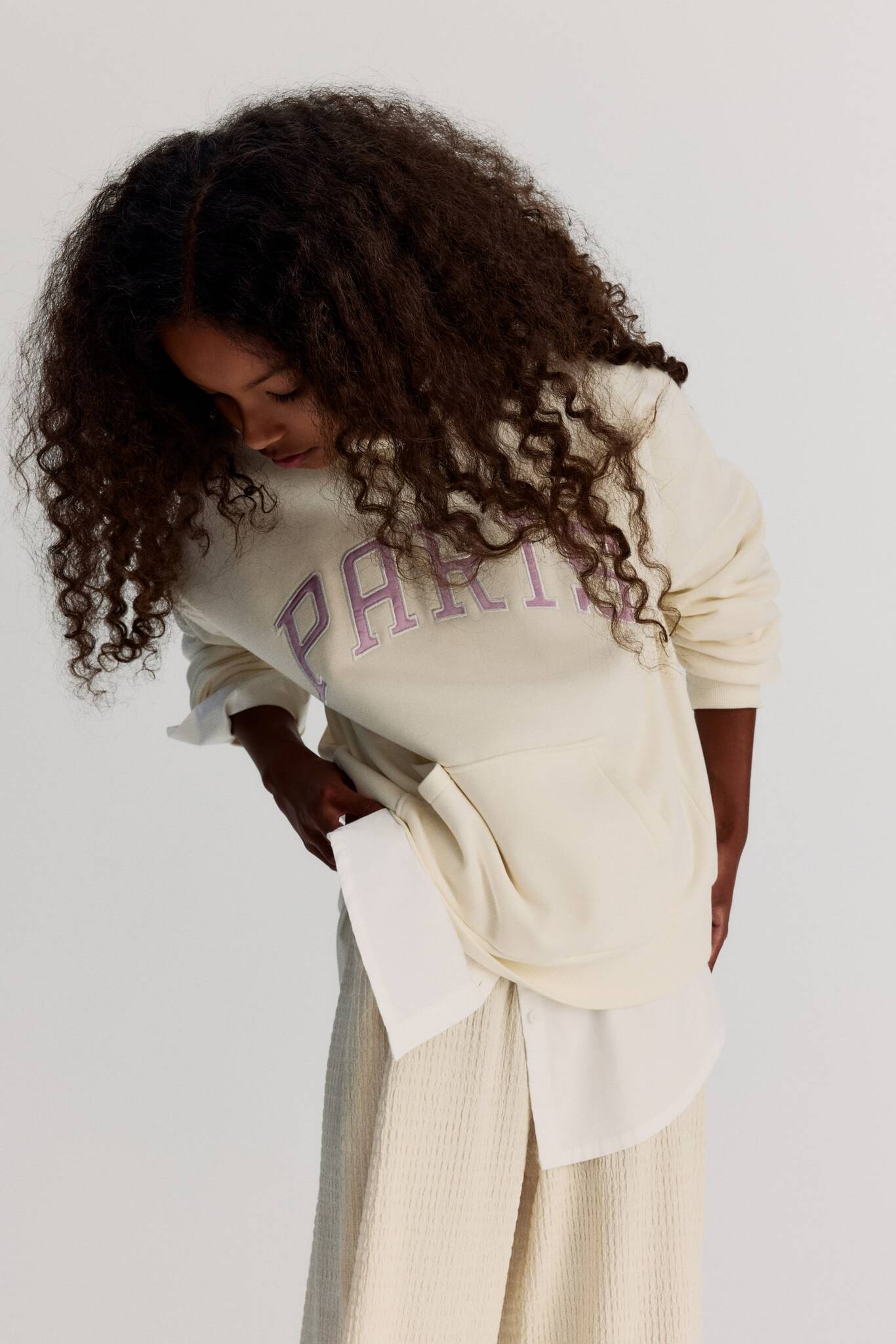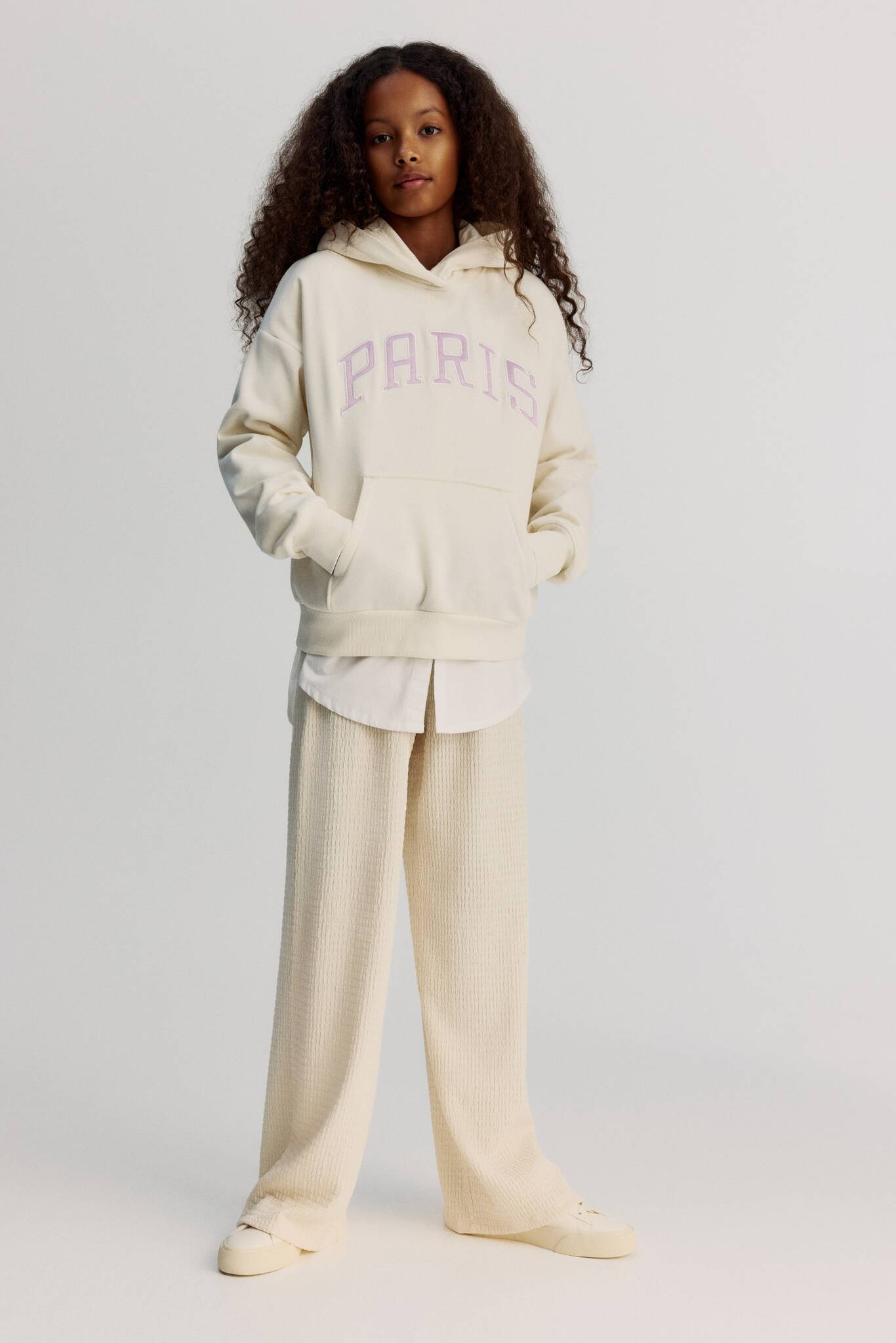 Свободный джемпер с капюшоном из мягкой толстовки на флисовой подкладке с декоративным мотивом спереди. Капюшон на трикотажной подкладке с запахом спереди, глубокими плечами и карманом-кенгуру. Длинные рукава с резинкой на манжетах и подоле.