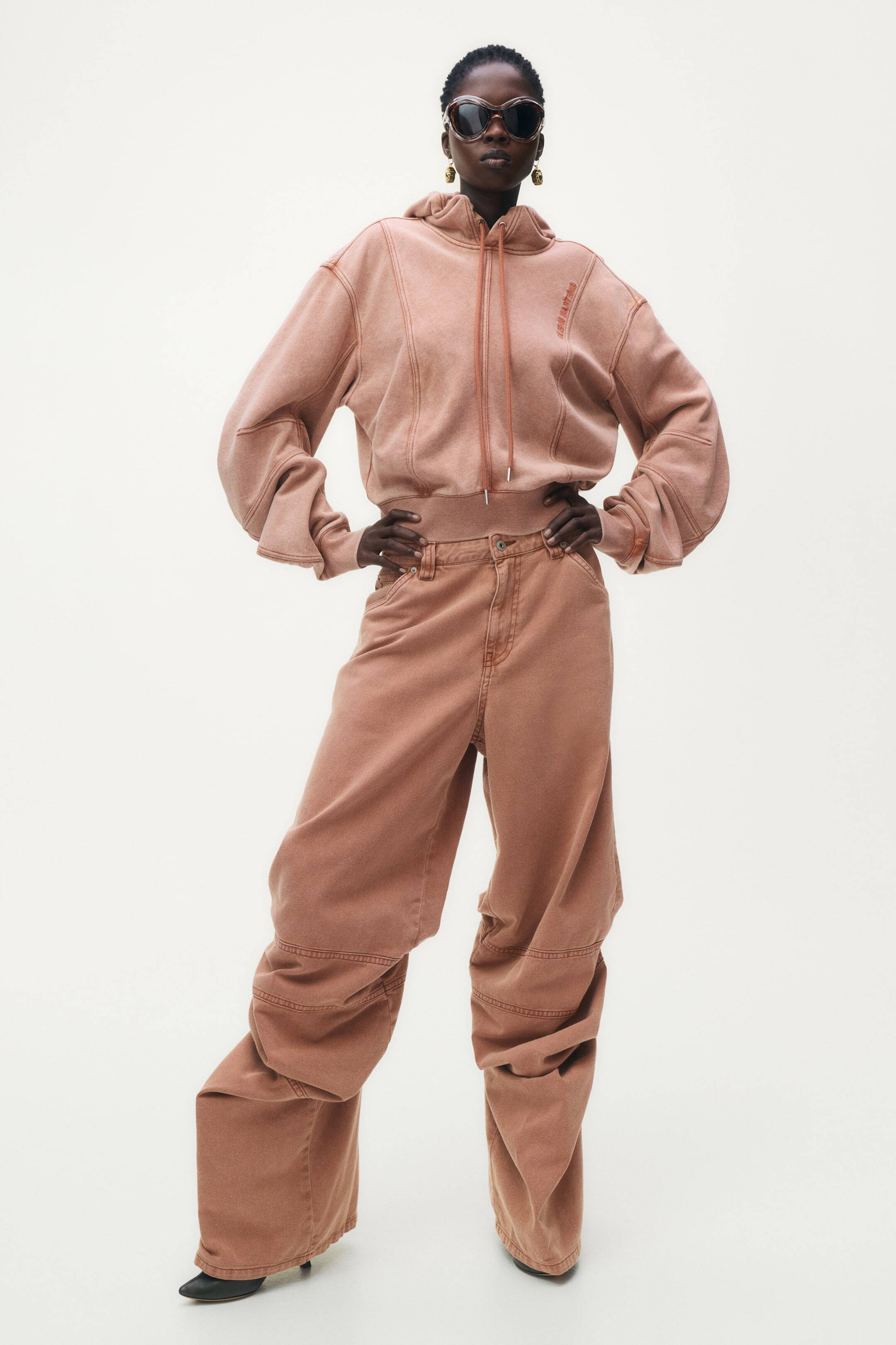 Свободная толстовка с капюшоном из выцветшего хлопкового с вышитым на груди логотипом дизайнера. Двухслойный капюшон на шнурке, спущенная линия плеча и закругленные длинные рукава. Заметная строчка по всему изделию подчеркивает свободный крой. Ребристая отделка на манжетах и подоле.