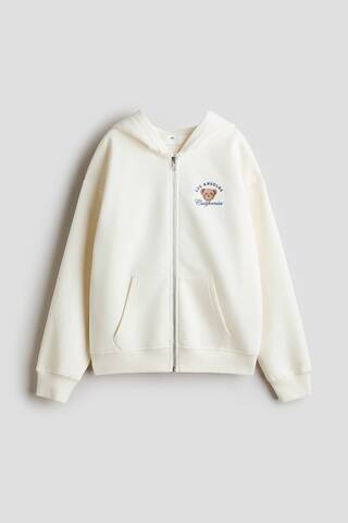 Толстовка свободного кроя с капюшоном и застежкой-молнией, мягкой флисовой подкладкой и вышитым текстовым мотивом спереди. Капюшон на трикотажной подкладке, спущенная линия плеча, застежка-молния спереди с защитой подбородка, не раздражающей кожу, и передние карманы. Манжеты и нижний край – резинка.