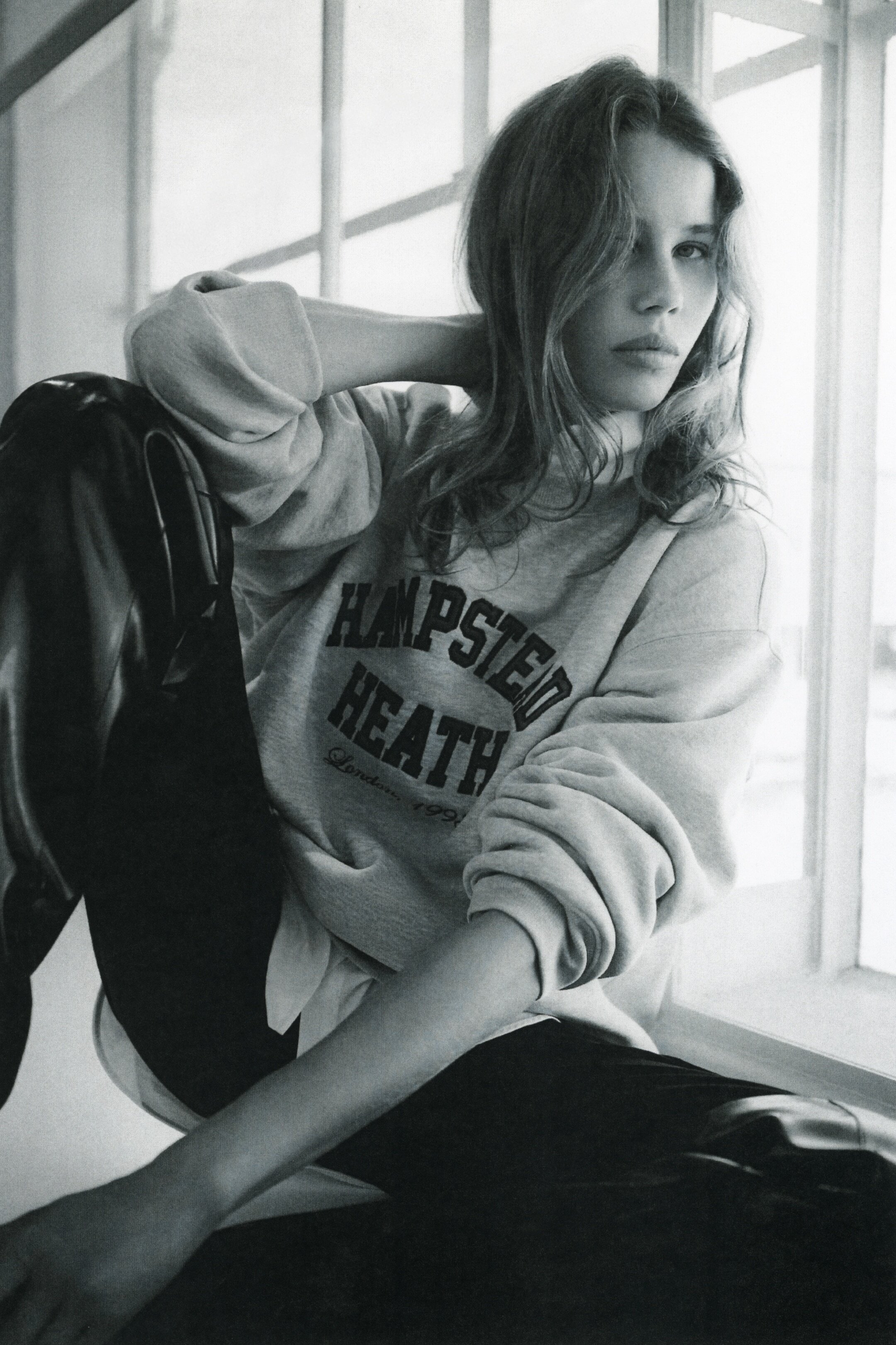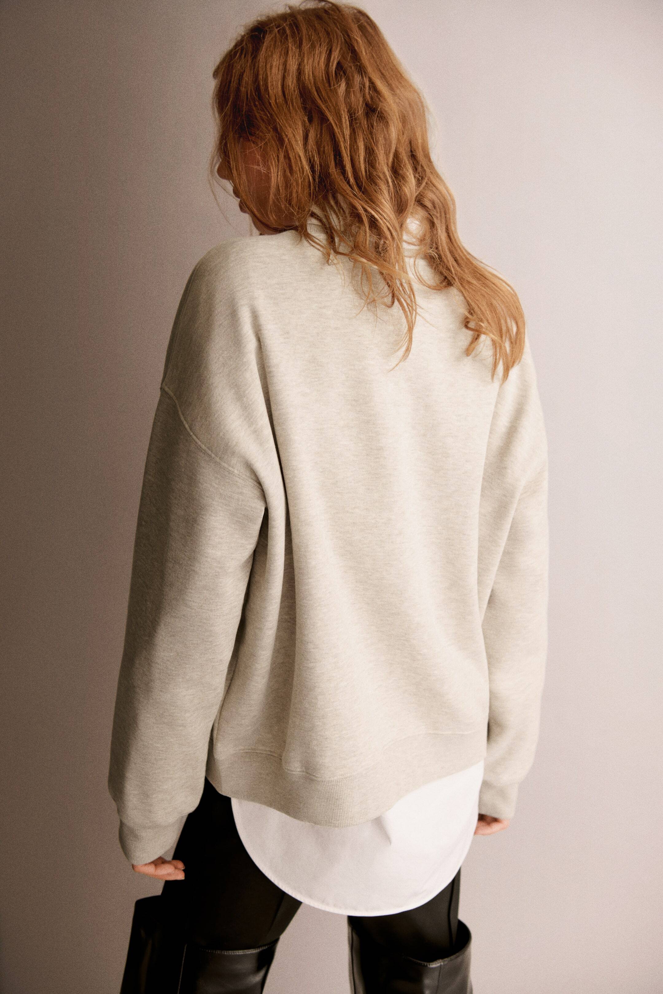 Свободный топ из мягкой толстовки на флисовой подкладке с текстовым мотивом на груди. Спущенная линия плеча, длинные рукава, резинка на горловине, манжетах и подоле.