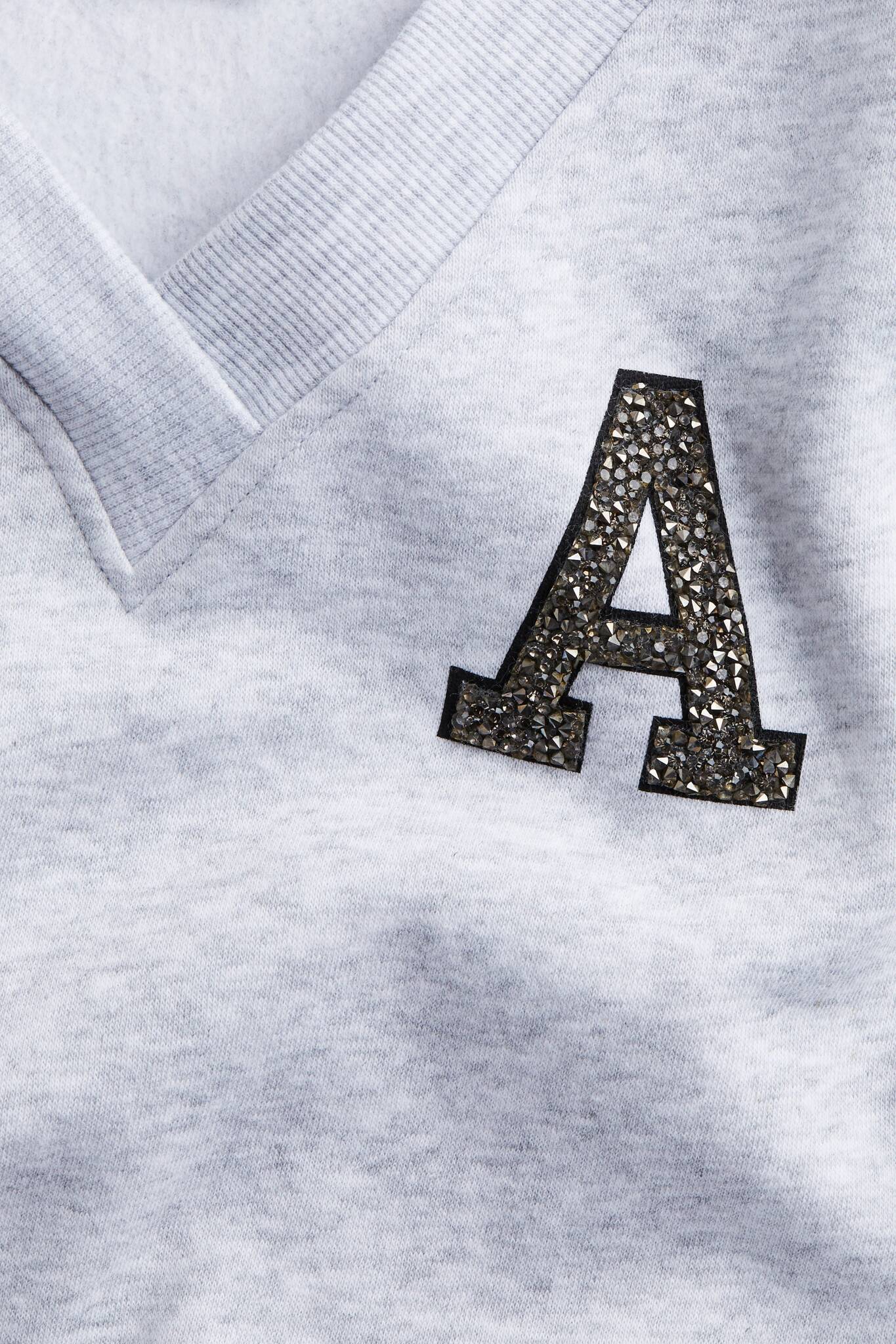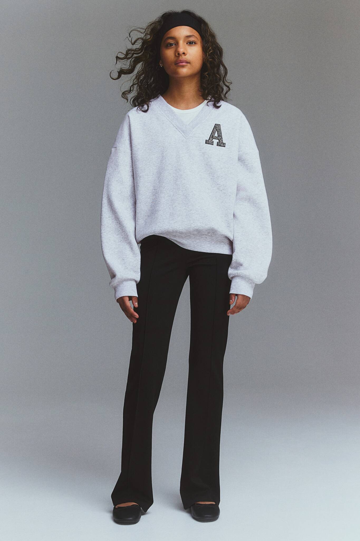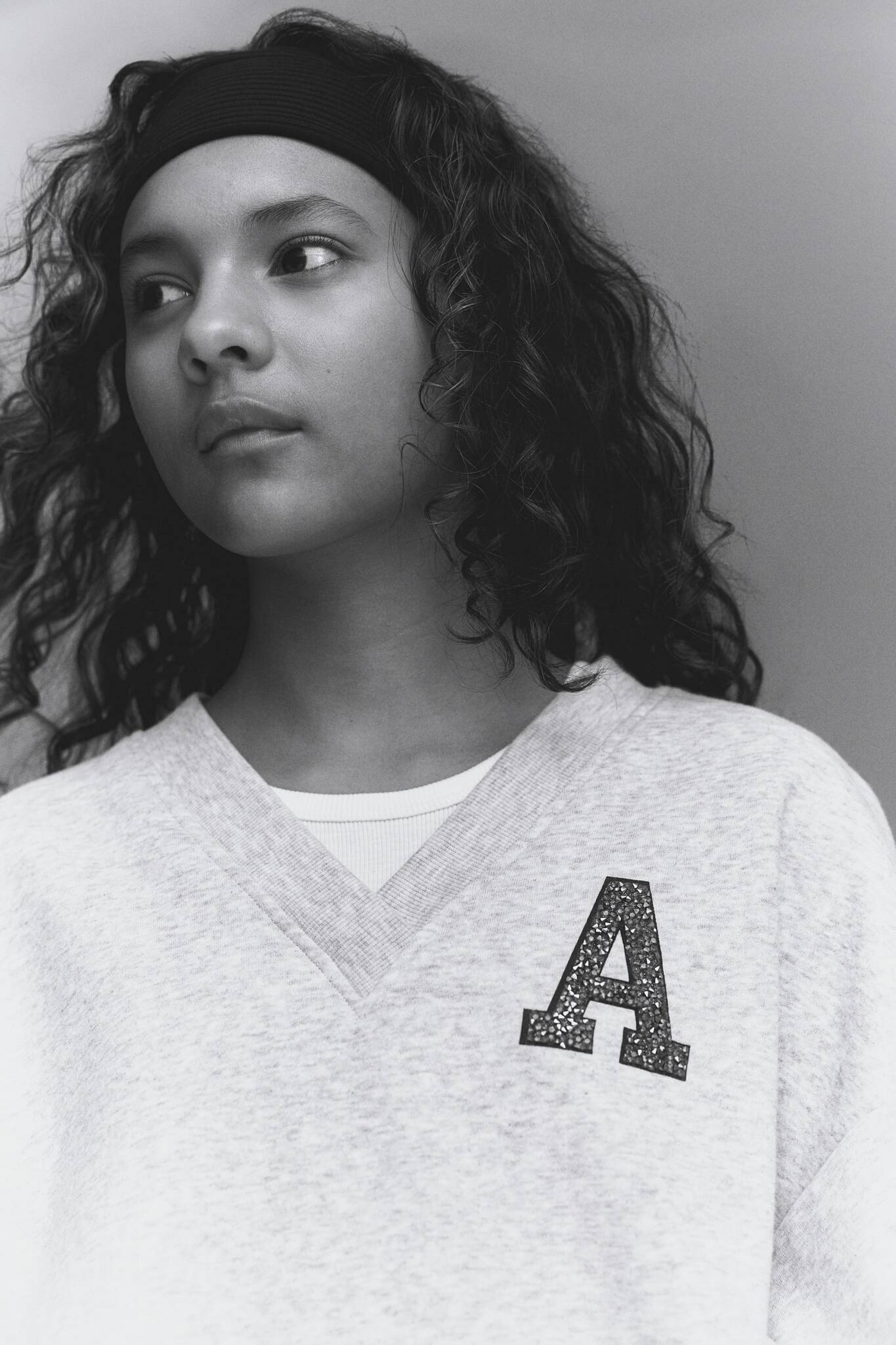 Толстовка на флисовой подкладке с V-образным вырезом в рубчик. Спущенная линия плеча, длинные рукава и широкая резинка на манжетах и подоле.
